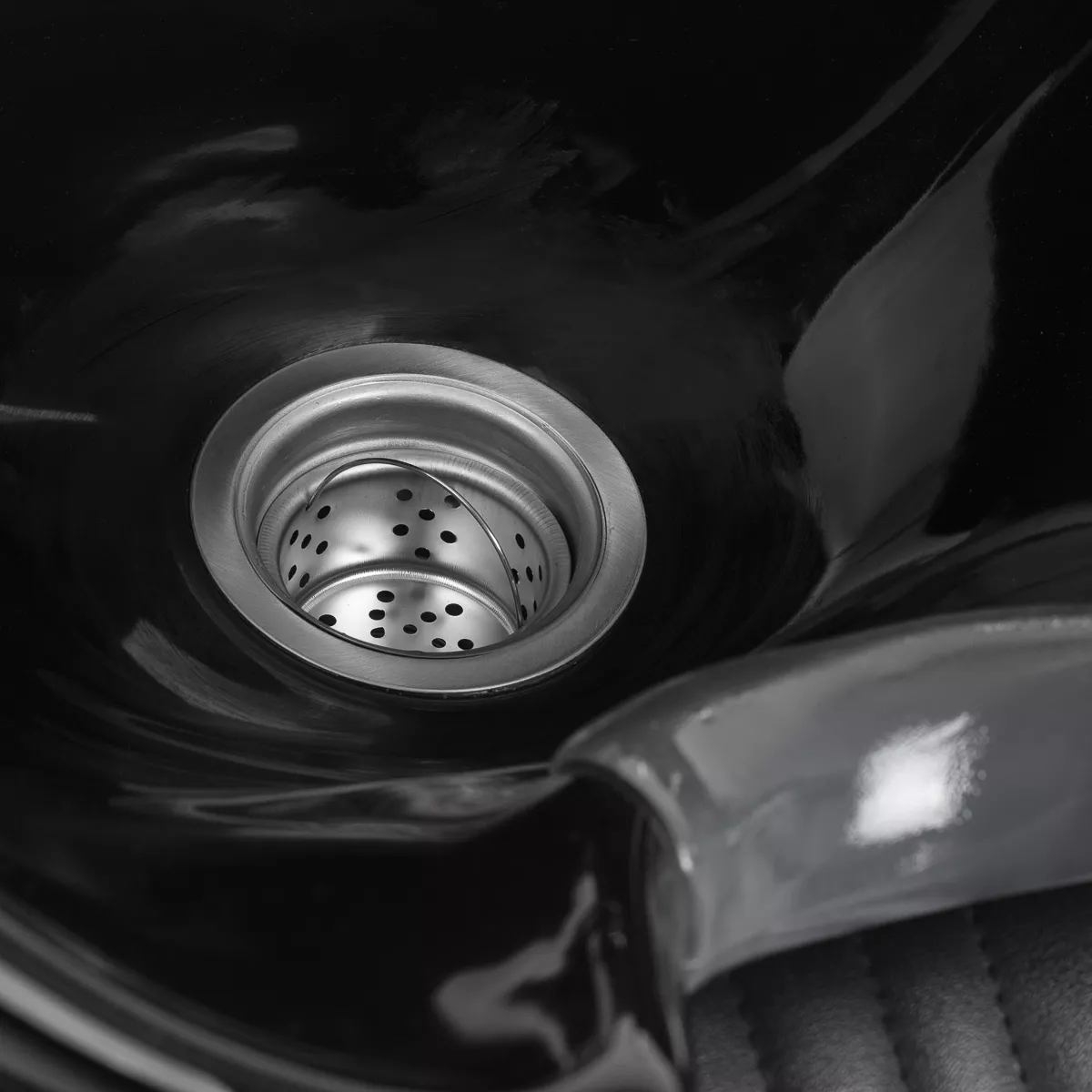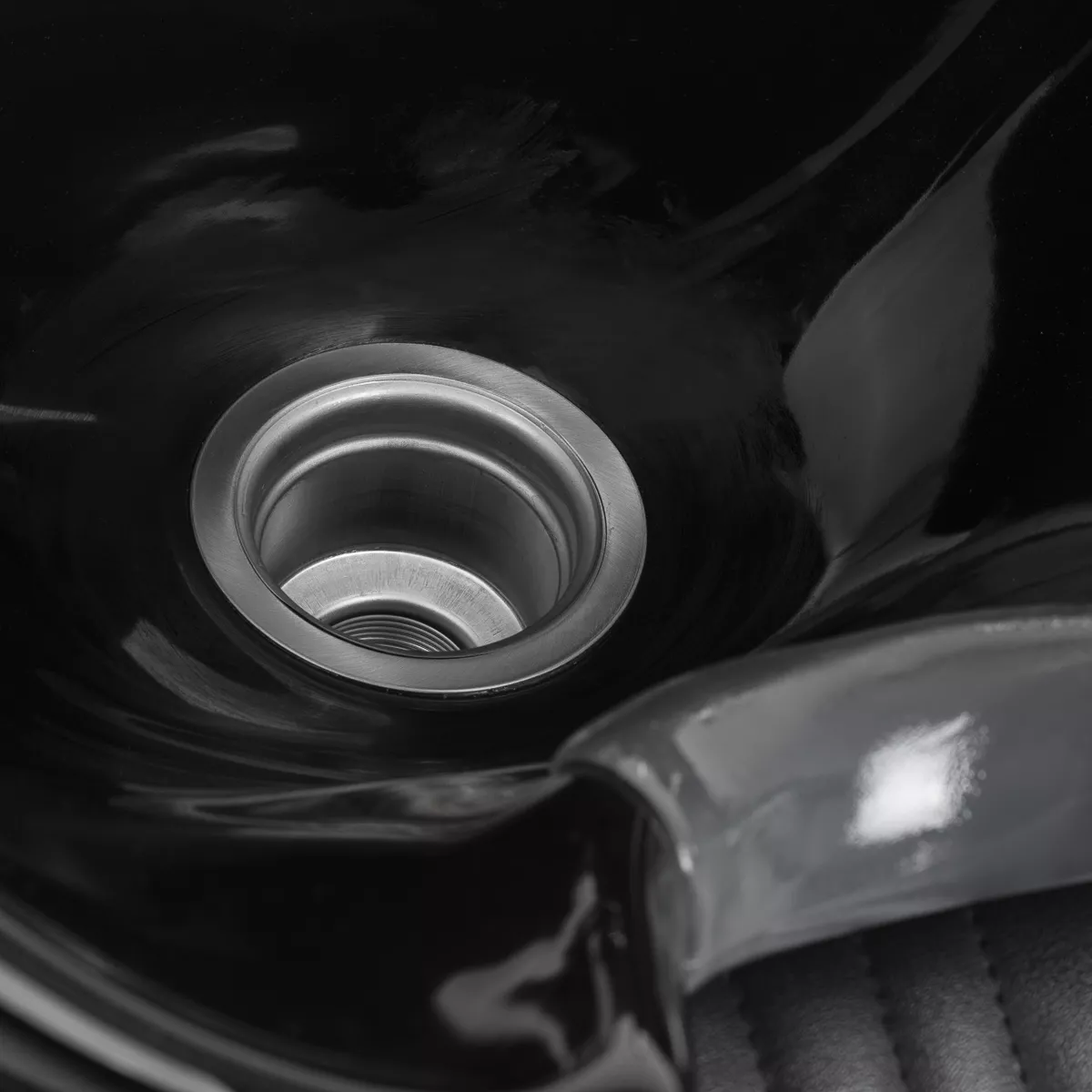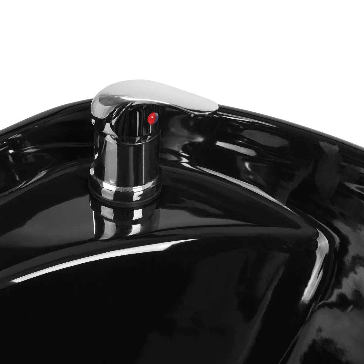 Głęboka ceramiczna misa umywalki w odcieniach czerni zapobiega nadmiernemu rozchlapywaniu wody oraz preparatów używanych podczas zabiegów. Pozwala to na komfortowe i efektywne wykonywanie szerokiej gamy usług fryzjerskich. Ruchomość misy ułatwia dopasowanie kąta jej nachylenia do indywidualnych potrzeb. Zastosowany materiał sprawia, że umywalka jest wytrzymała, odporna na przebarwienia i zadrapania oraz bardzo łatwa do utrzymania w czystości. Odpowiednio wyprofilowany kołnierz misy zapewnia optymalne wsparcie oraz wygodę w trakcie mycia włosów, a komfortowa nakładka z tworzywa sztucznego w odcieniach czerni sprawia, że klient nie odczuje nieprzyjemności związanych z chłodem ceramicznej powierzchni.