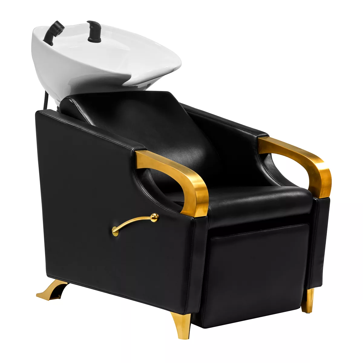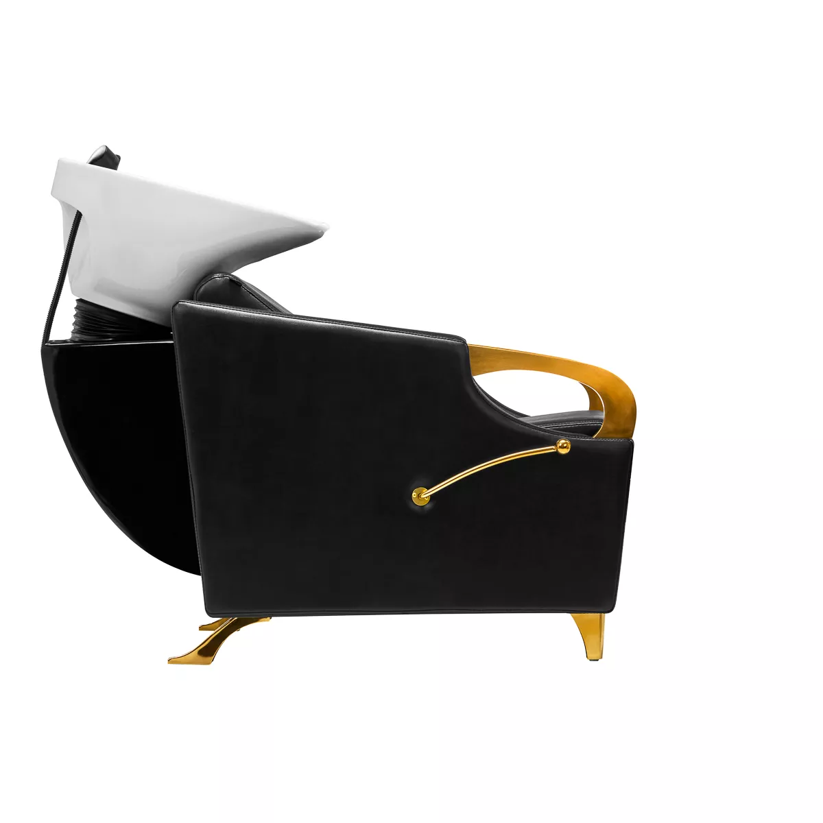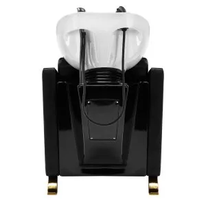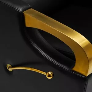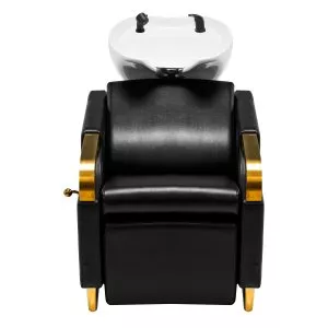 Wyprofilowany fotel wypełniony trwałą pianką zapewnia odpowiednie wsparcie lędźwi, a co za tym idzie wysoki komfort użytkowania. Podłokietniki z elementami w odcieniach złota pozwalają na prawidłowe ułożenie barków klienta. Przyjemne w dotyku pokrycie ze skóry syntetycznej w odcieniach czerni zapewnia wieloletnią wytrzymałość oraz łatwość czyszczenia. Elegancki wygląd myjni nadaje wnętrzom niepowtarzalnego wyrazu. Nóżki oraz dźwignia w odcieniach złota dodają stabilności oraz subtelnie podkreślają stylowy charakter myjni. W zestawie znajduje się kompletna armatura w odcieniach czerni, w tym bateria, słuchawka prysznicowa oraz dedykowane węże, aby zapewnić całkowity zestaw narzędzi do pracy.