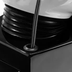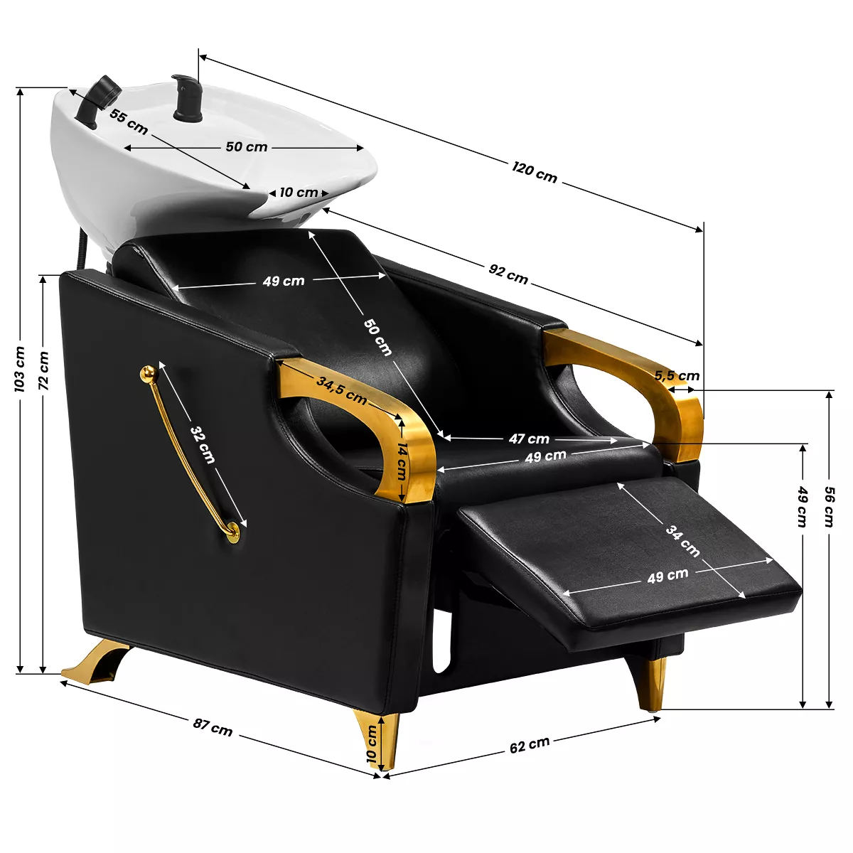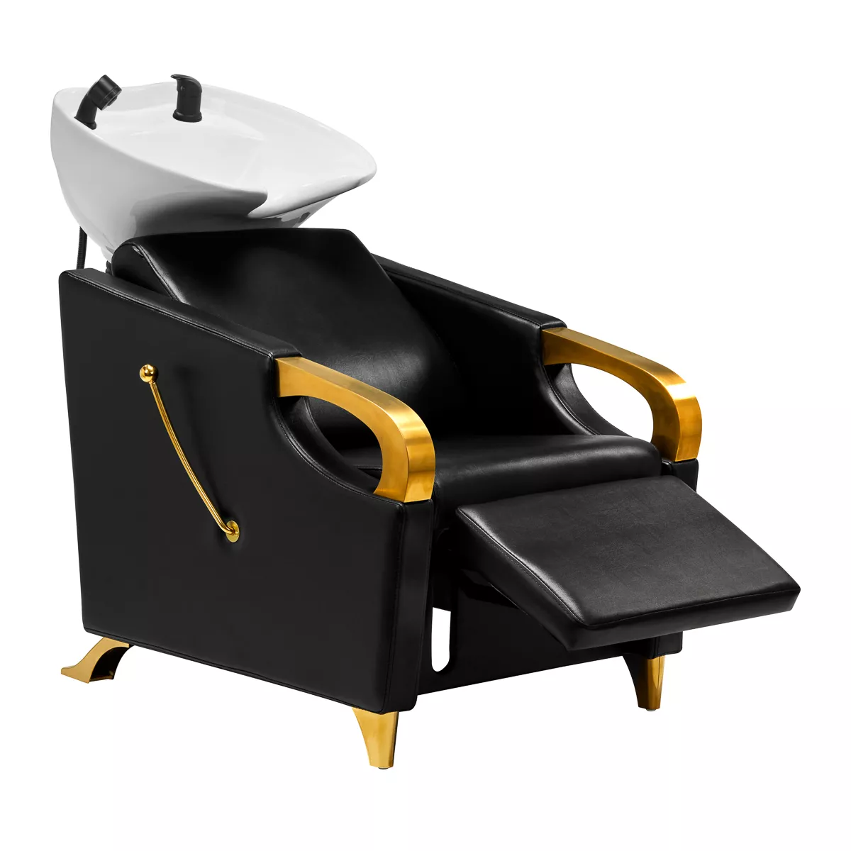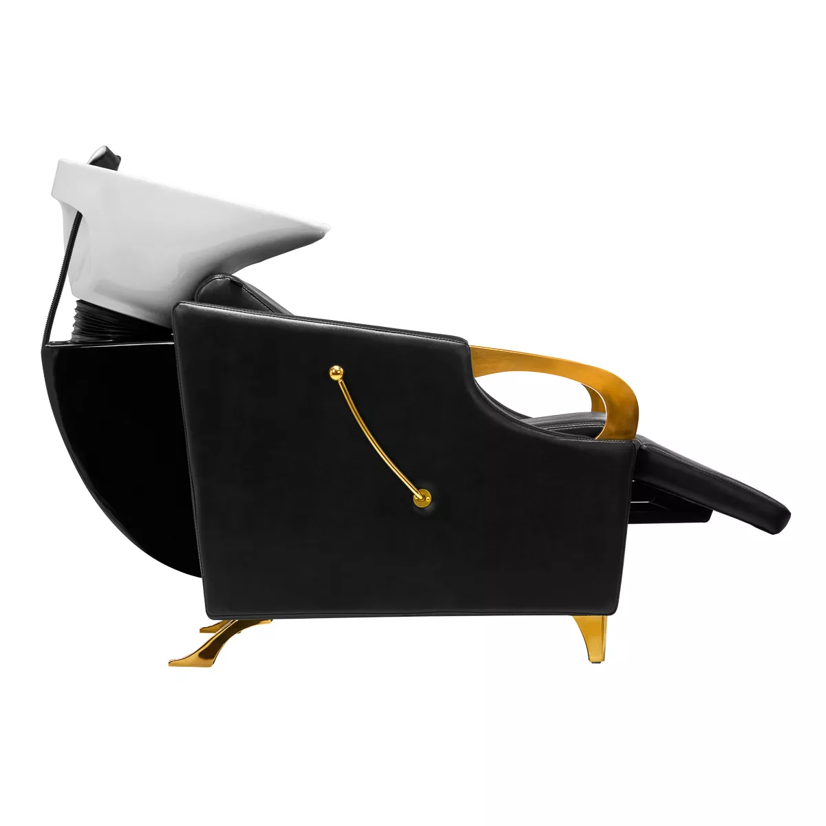 Wyprofilowany fotel wypełniony trwałą pianką zapewnia odpowiednie wsparcie lędźwi, a co za tym idzie wysoki komfort użytkowania. Podłokietniki z elementami w odcieniach złota pozwalają na prawidłowe ułożenie barków klienta. Przyjemne w dotyku pokrycie ze skóry syntetycznej w odcieniach czerni zapewnia wieloletnią wytrzymałość oraz łatwość czyszczenia. Elegancki wygląd myjni nadaje wnętrzom niepowtarzalnego wyrazu. Nóżki oraz dźwignia w odcieniach złota dodają stabilności oraz subtelnie podkreślają stylowy charakter myjni. W zestawie znajduje się kompletna armatura w odcieniach czerni, w tym bateria, słuchawka prysznicowa oraz dedykowane węże, aby zapewnić całkowity zestaw narzędzi do pracy.