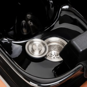 Ceramiczna misa umywalki w odcieniach czerni, o nowoczesnym kształcie i odpowiedniej głębokości, skutecznie zapobiega rozchlapywaniu wody oraz produktów używanych podczas zabiegów, umożliwiając komfortowe i efektywne wykonywanie szerokiej gamy usług. Odpowiednio wyprofilowany kołnierz oraz nachylone oparcie zapewniają wygodę i wsparcie podczas mycia włosów, a nakładka z tworzywa sztucznego w odcieniach czerni chroni klienta przed chłodem ceramicznej powierzchni, gwarantując przyjemne doznania w trakcie zabiegu.