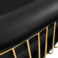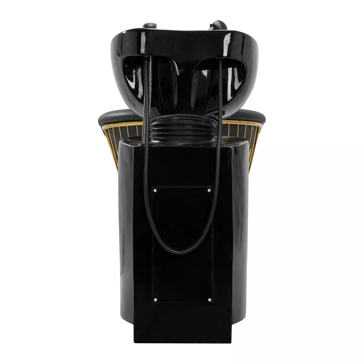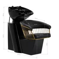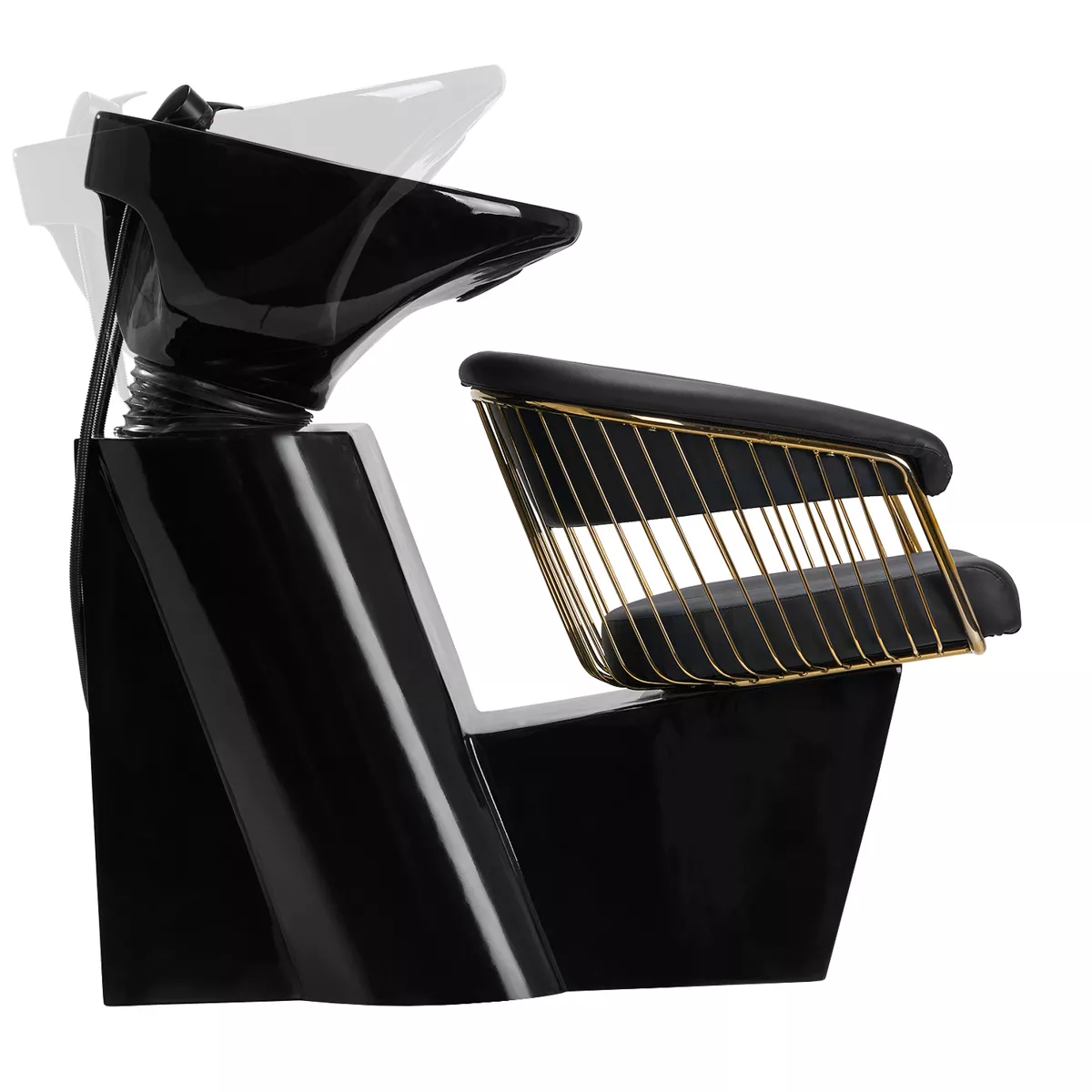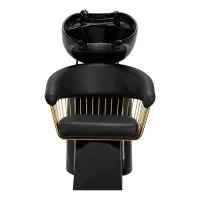 Odpowiednio wyprofilowany fotel wypełniony trwałą pianką zapewnia wysoki komfort użytkowania i relaks klienta na czas usługi. Pokrycie ze skóry syntetycznej w odcieniach czerni zapewnia wieloletnią wytrzymałość oraz łatwość czyszczenia. Oryginalny, elegancki wygląd myjni wraz z polerowanymi elementami w odcieniach złota nadają przestrzeni niepowtarzalnego wyrazu. W zestawie znajduje się kompletna armatura, w tym bateria, słuchawka prysznicowa oraz dedykowane węże, aby zapewnić całkowity zestaw narzędzi do pracy.
