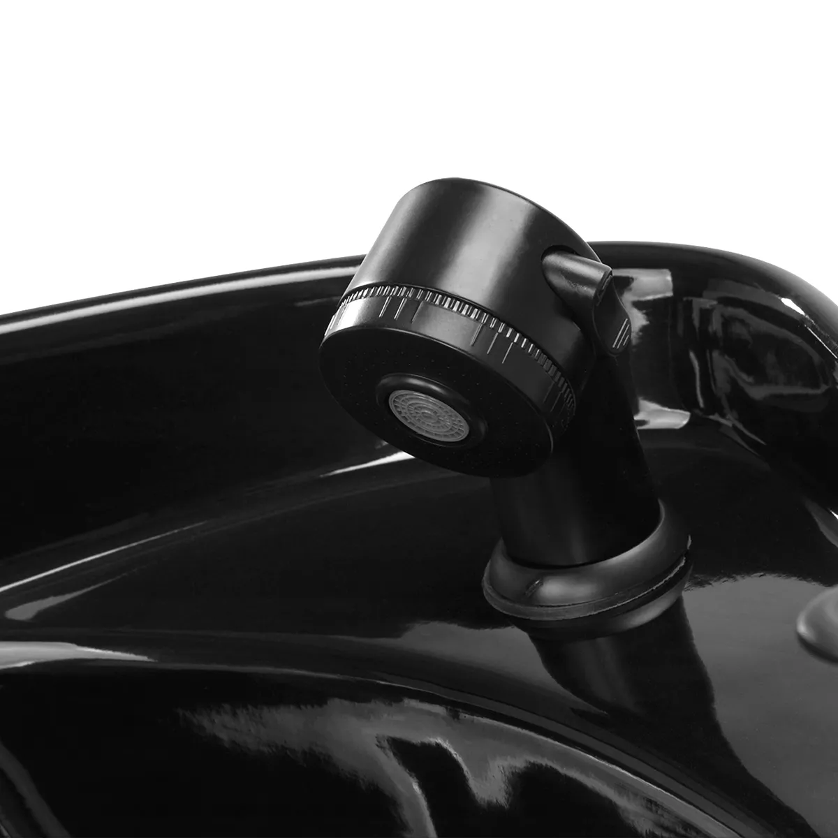 Czarna ceramiczna misa umywalki o odpowiedniej głębokości zapobiega nadmiernemu rozchlapywaniu wody oraz używanych w trakcie zabiegu produktów, pozwalając na komfortowe wykonywanie szerokiej gamy usług. Możliwość dostosowania kąta nachylenia misy pozwala dopasować ustawienie do indywidualnych potrzeb. Zastosowany materiał sprawia, że umywalka jest wytrzymała, odporna na przebarwienia i zadrapania oraz bardzo łatwa do czyszczenia. Odpowiednio wyprofilowany kołnierz zapewnia wsparcie i wygodę w trakcie mycia włosów, a dzięki komfortowej nakładce z tworzywa sztucznego klient nie odczuje nieprzyjemności związanych z chłodem ceramicznej powierzchni.