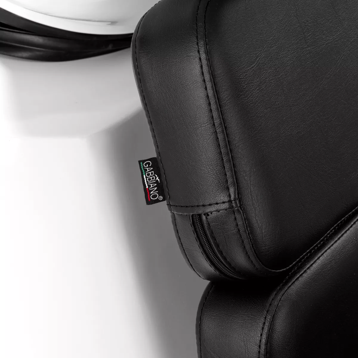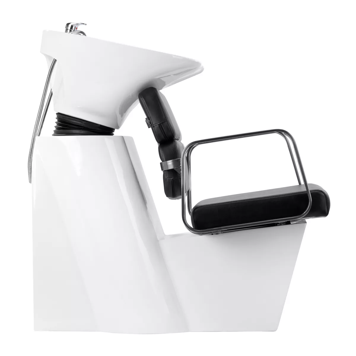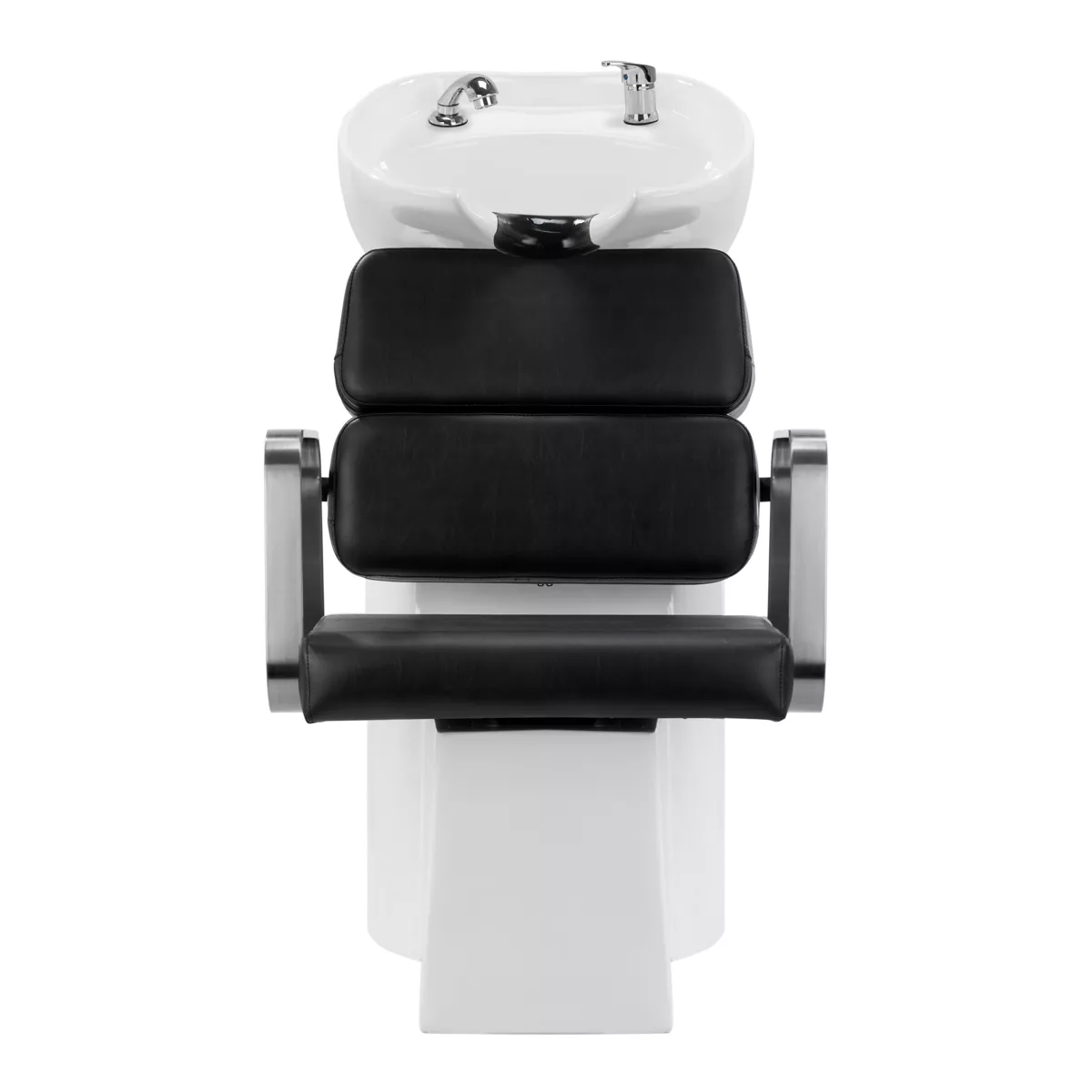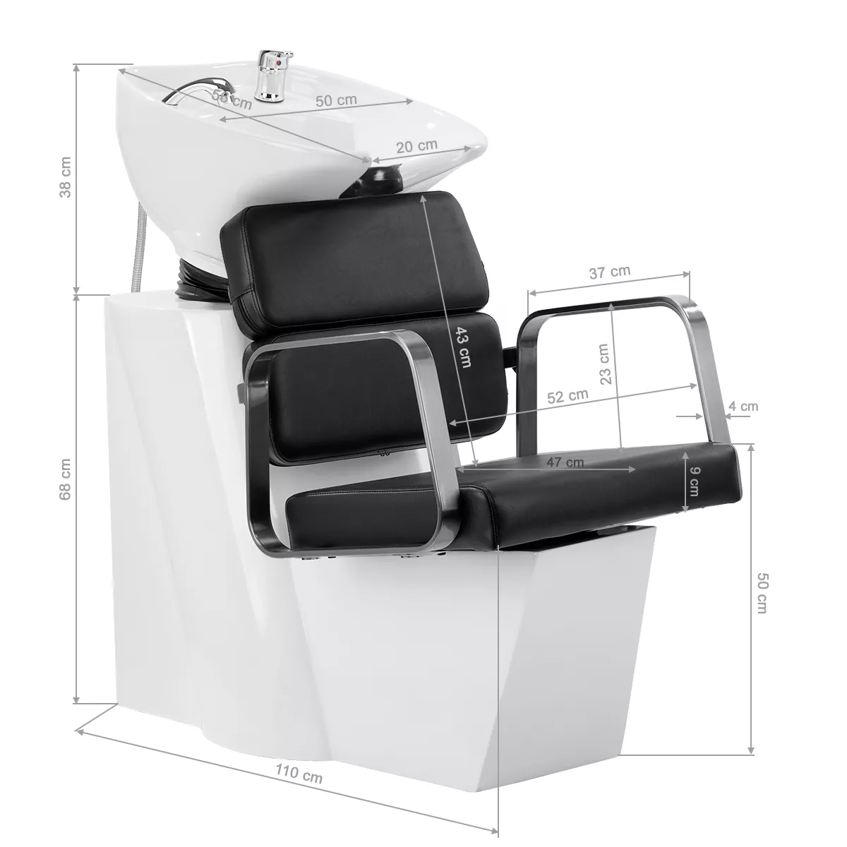 Wyprofilowany fotel zapewnia odpowiednie wsparcie lędźwi, a co za tym idzie wysoki komfort użytkowania. Metalowe podłokietniki w odcieniach chromu o geometrycznym kształcie pozwalają na prawidłowe ułożenie barków klienta. Wypełnienie z trwałej, odpornej na odkształcenia pianki oraz obicie wykonane z przyjemnej w dotyku skóry syntetycznej w odcieniach czerni zapewniają trwałość mebla, łatwość czyszczenia i komfortowe użytkowanie przez długi czas. Oryginalny, elegancki wygląd myjni nadaje wnętrzom niepowtarzalnego wyrazu. W zestawie znajduje się kompletna armatura w odcieniach chromu, w tym bateria, słuchawka prysznicowa oraz dedykowane węże, aby zapewnić kompletny zestaw narzędzi do pracy.