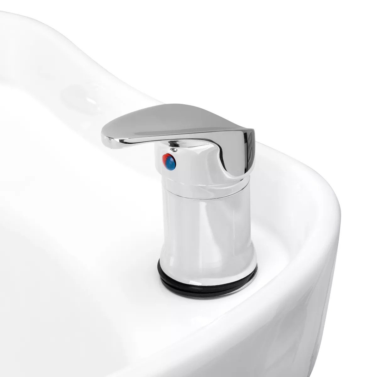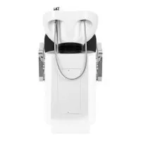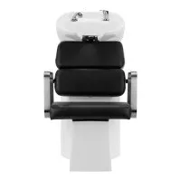 Odpowiednia głębokość białej ceramicznej misy umywalki zapobiega nadmiernemu rozchlapywaniu wody czy produktów stosowanych w trakcie zabiegów. Pozwala to na komfortowe i efektywne wykonywanie szerokiej gamy usług. Kąt nachylenia misy można dostosowywać, dzięki czemu łatwo o dopasowanie do indywidualnych potrzeb. Wysoka jakość zastosowanych materiałów sprawia, że umywalka jest wytrzymała, odporna na przebarwienia i zadrapania oraz bardzo łatwa do czyszczenia. Odpowiednio wyprofilowany kołnierz oraz nachylone oparcie zapewniają wsparcie i wygodę w trakcie mycia włosów, a dzięki komfortowej nakładce z tworzywa sztucznego w odcieniach czerni klient nie odczuje nieprzyjemności związanych z chłodem ceramicznej powierzchni.