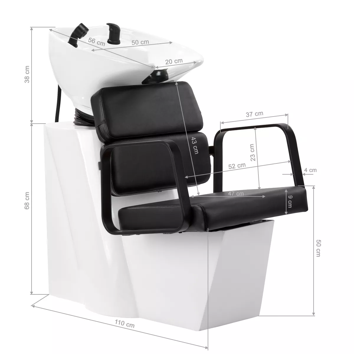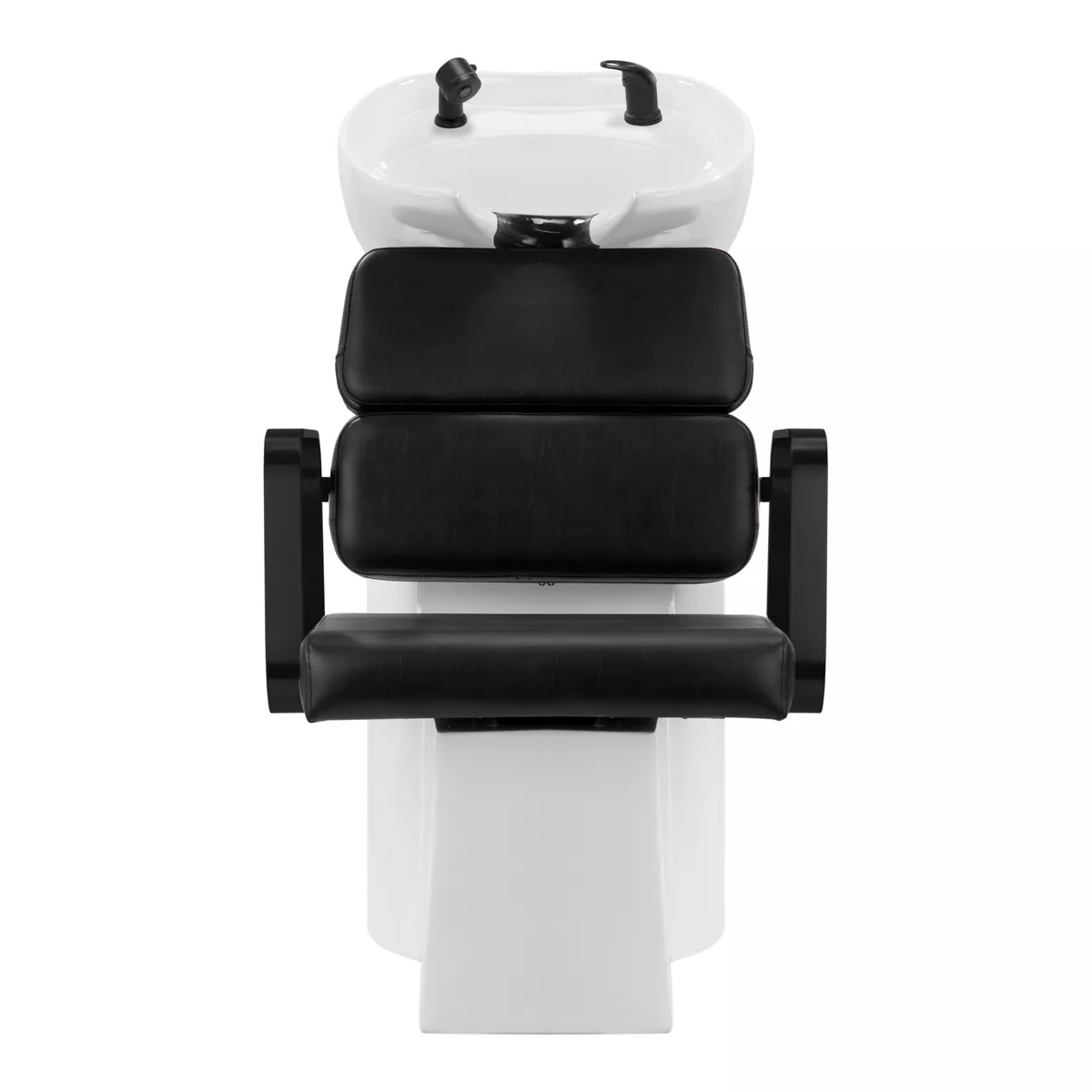 Wyprofilowany fotel zapewnia odpowiednie wsparcie lędźwi, a co za tym idzie wysoki komfort użytkowania. Metalowe podłokietniki w odcieniach czerni o geometrycznym kształcie pozwalają na prawidłowe ułożenie barków klienta. Wypełnienie z trwałej, odpornej na odkształcenia pianki oraz obicie wykonane z przyjemnej w dotyku skóry syntetycznej w odcieniach czerni zapewniają trwałość mebla, łatwość czyszczenia i komfortowe użytkowanie przez długi czas. Oryginalny, elegancki wygląd myjni nadaje wnętrzom niepowtarzalnego wyrazu. W zestawie znajduje się kompletna armatura w odcieniach czerni, w tym bateria, słuchawka prysznicowa oraz dedykowane węże, aby zapewnić kompletny zestaw narzędzi do pracy.