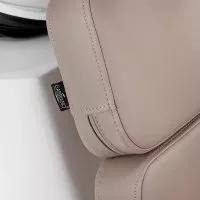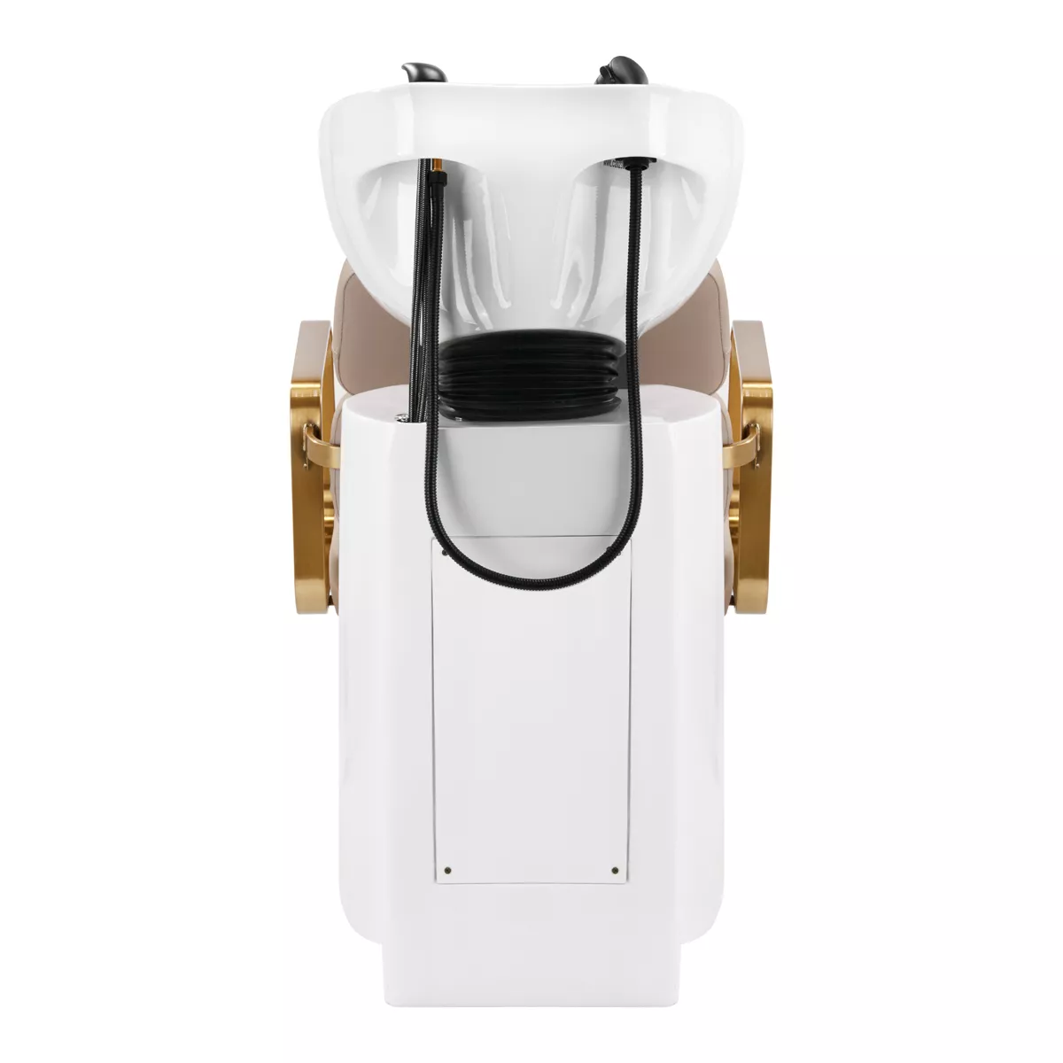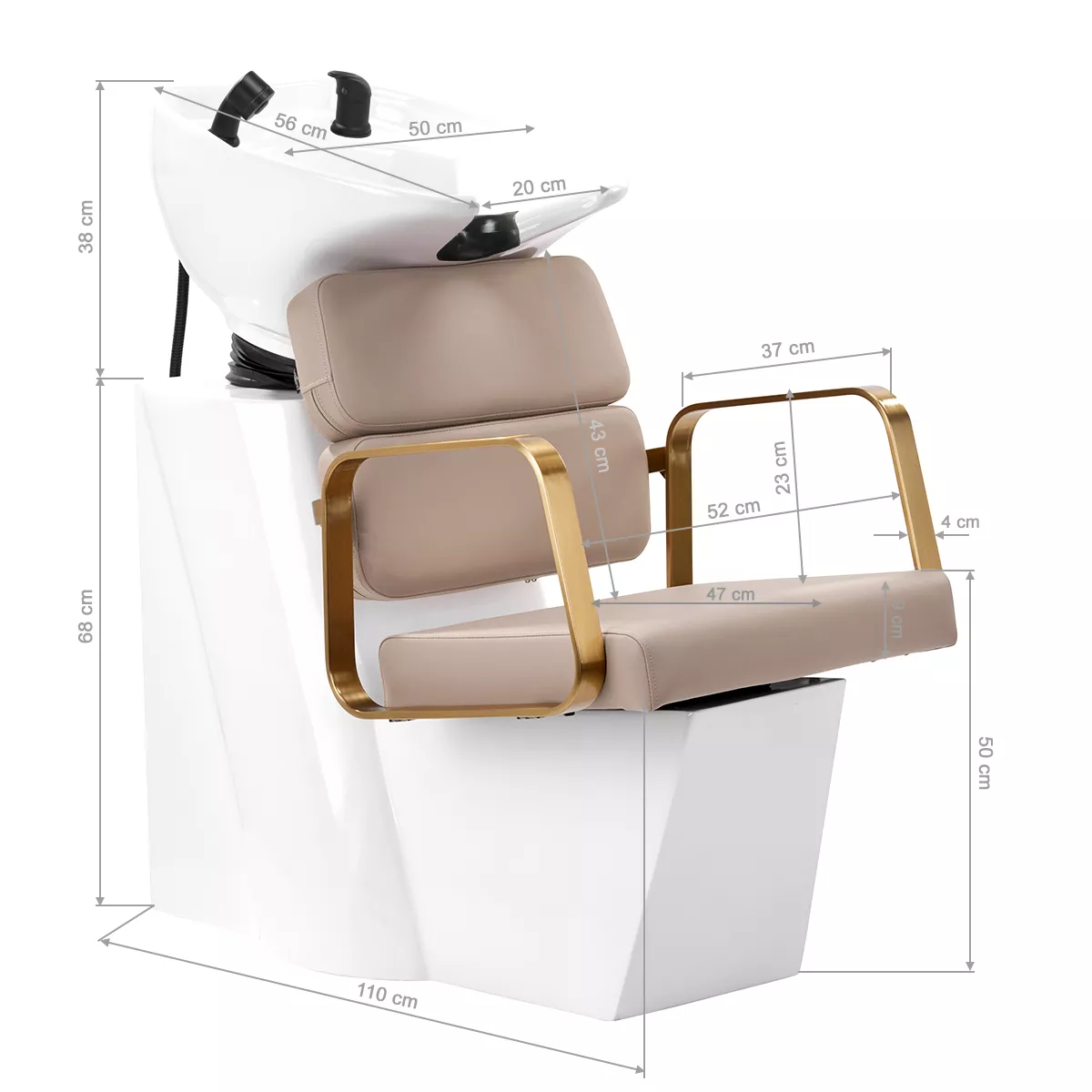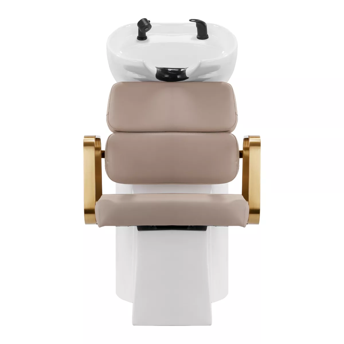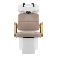 Wyprofilowany fotel zapewnia odpowiednie wsparcie lędźwi, a co za tym idzie wysoki komfort użytkowania. Metalowe podłokietniki w odcieniach złota o geometrycznym kształcie pozwalają na prawidłowe ułożenie barków klienta. Wypełnienie z trwałej, odpornej na odkształcenia pianki oraz obicie wykonane z przyjemnej w dotyku skóry syntetycznej w odcieniach beżu zapewniają trwałość mebla, łatwość czyszczenia i komfortowe użytkowanie przez długi czas. Oryginalny, elegancki wygląd myjni nadaje wnętrzom niepowtarzalnego wyrazu. W zestawie znajduje się kompletna armatura w odcieniach czerni, w tym bateria, słuchawka prysznicowa oraz dedykowane węże, aby zapewnić kompletny zestaw narzędzi do pracy.