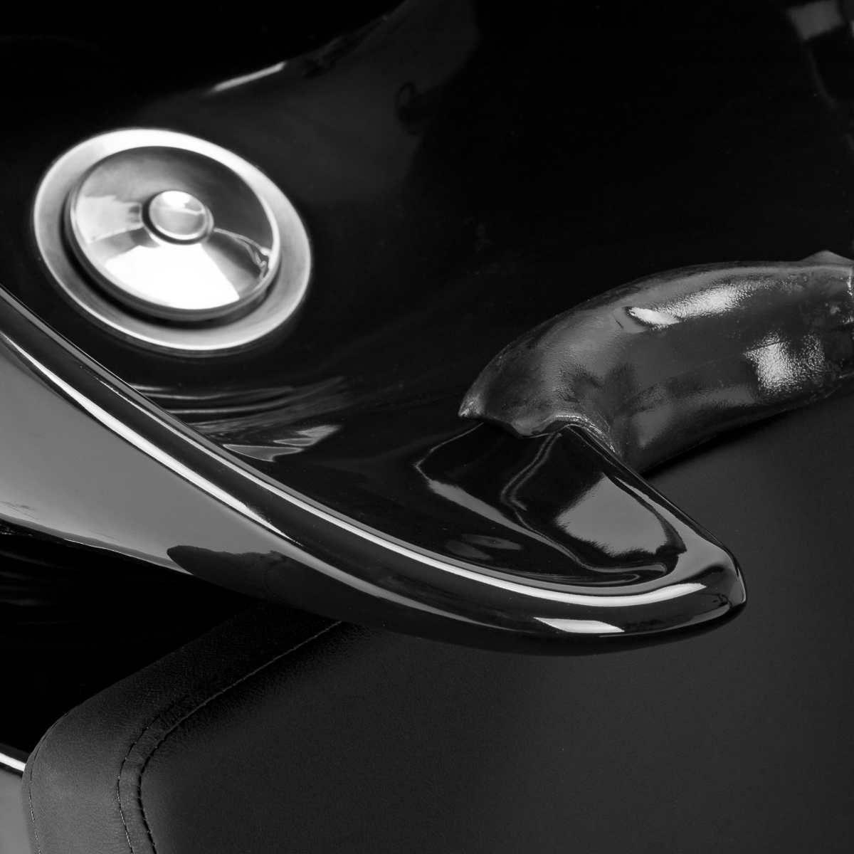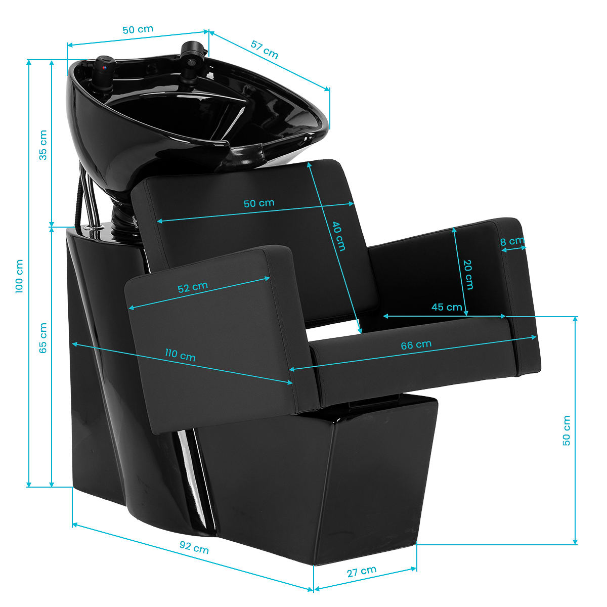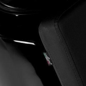 Fotel o geometrycznej formie łączy nowoczesną prostotę z wygodą użytkowania. Siedzisko i podłokietniki o łagodnych kątach tworzą harmonijną całość, zapewniając komfortową pozycję podczas zabiegów, a oparcie o optymalnym kącie nachylenia wspiera prawidłową postawę i odprężenie. Tapicerka z wysokiej jakości skóry syntetycznej w odcieniach czerni jest odporna na zużycie i wilgoć, a przy tym łatwa do utrzymania w czystości. Prosta, nowoczesna forma mebla podkreśla elegancki charakter myjni, a kompletna armatura – bateria, słuchawka prysznicowa i dedykowane węże – zapewnia pełny zestaw narzędzi do pracy.