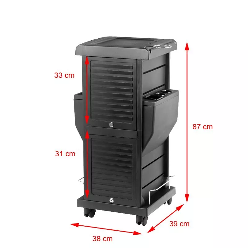 - Posiada 4 pojemne kuwety oraz 15 schowków na różnorodny asortyment fryzjerski, co ułatwia organizację pracy.