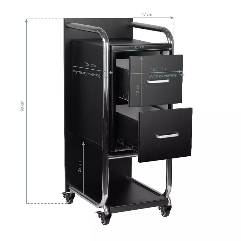 Wysokiej jakości pomocnik fryzjerski Gabbiano Solo to elegancki element wyposażenia, który znacząco usprawnia pracę w salonie fryzjerskim. Dwie pojemne szuflady oraz dwie różnej wielkości półki znacząco ułatwiają organizację produktów i niezbędnych narzędzi. Gumowane kółka z hamulcami zapewniają odpowiednią mobilność, co pozwala na swobodne ustawianie mebla w dowolnym miejscu salonu. Elegancki design – polerowane metalowe elementy w odcieniach srebra oraz stabilna konstrukcja z drewnianych płyt w odcieniach czerni – doskonale podkreśli charakter wnętrz.