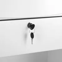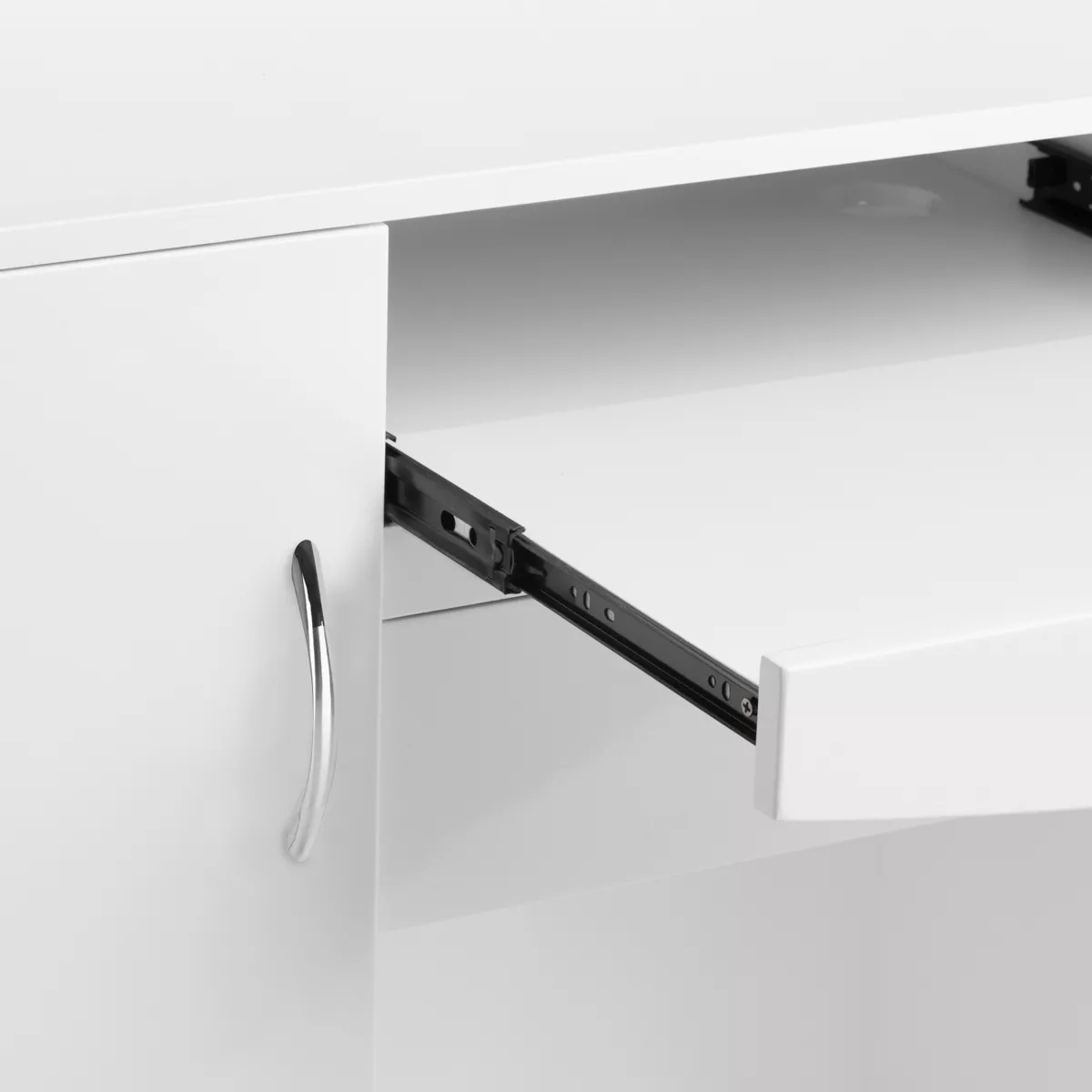 Recepcja jest zaprojektowana w taki sposób, by stanowić jak najbardziej pojemny i praktyczny element umeblowania. Dla wygody korzystania została wyposażona w: trzy różnego rozmiaru otwarte półki, jedną półkę wysuwaną, szufladę zamykaną na klucz oraz dwie zamykane szafki z estetycznymi uchwytami w odcieniach srebra. Przestrzenie zostały rozplanowane w taki sposób, by jak najbardziej ułatwić organizację oraz zachowanie porządku w miejscu, w którym zgromadzone są wszystkie ważne dokumenty.