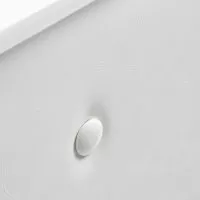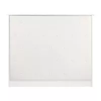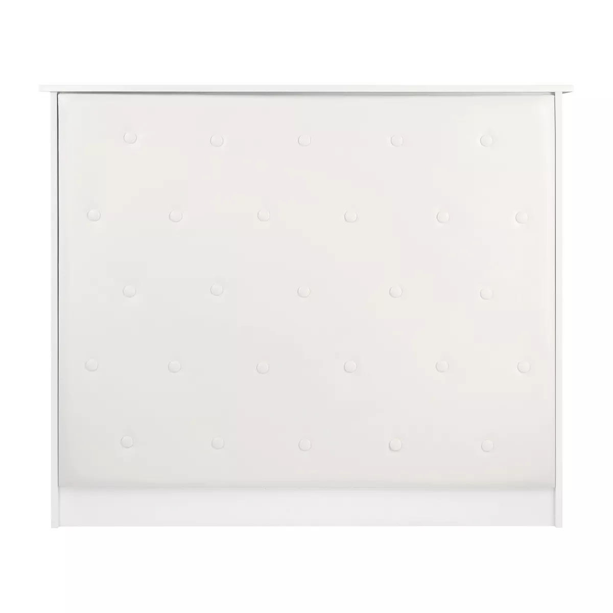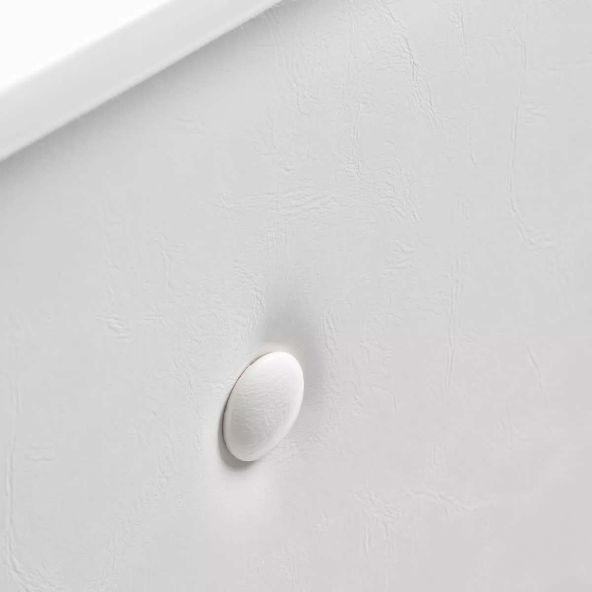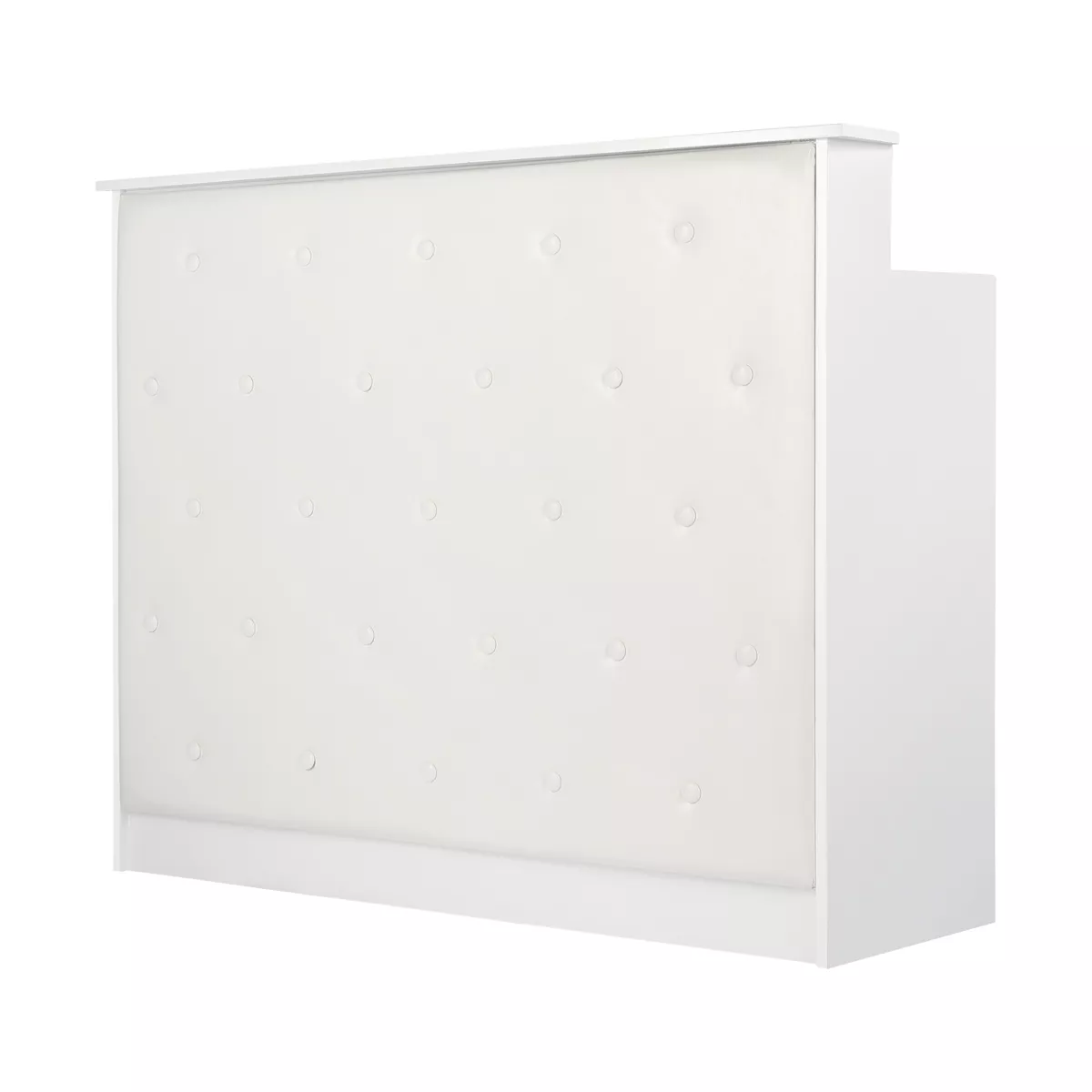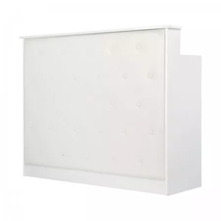 Mebel ten wykonano z wysokiej jakości, trwałej płyty laminowanej w odcieniach bieli, a gładkie powierzchnie nie sprawiają problemów w utrzymaniu czystości – w razie zabrudzenia wystarczy przetrzeć je wilgotną ściereczką. Ozdobna część frontalna została obita skórą syntetyczną w odcieniach bieli, co nadaje jej stylowego sznytu, zapewnia trwałość mebla oraz łatwość czyszczenia. Ozdobne guziki dodają elegancji i wyjątkowości, podkreślając charakter wnętrza. Recepcja została starannie wykonana, jest stabilna, a zastosowane materiały pozwalają na wieloletnie efektywne użytkowanie.