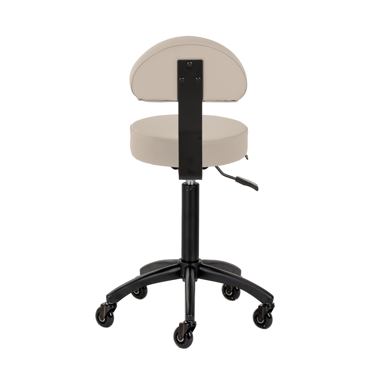Regulacja wysokości siedziska w zakresie 56-76 cm umożliwia dopasowanie pozycji do indywidualnych potrzeb specjalisty podczas wykonywania usług. Oparcie wspiera kręgosłup, zapewniając komfort nawet w trakcie długotrwałej pracy. Mechanizm pełnego obrotu zwiększa swobodę ruchów, co przekłada się na większą wygodę i efektywność pracy. Mobilność zapewniają kółka Roll Speed z żelaznym rdzeniem i powłoką z poliuretanu (PU), które łączą płynność ruchu z wyjątkową odpornością na zużycie. Zastosowanie łożysk klasy ABEC-7 sprawia, że taboret porusza się łatwo, co znacząco ułatwia manewrowanie.