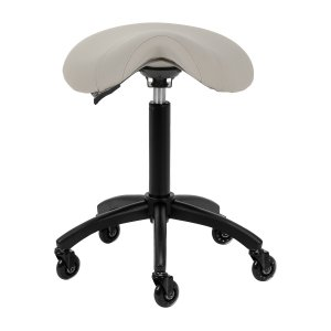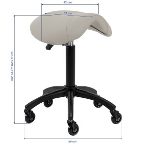Regulacja wysokości siedziska w zakresie 56-77 cm pozwala specjaliście dostosować pozycję w trakcie wykonywania usług. Odpowiednio wyprofilowane na kształt siodła siedzisko wypełnione niepodatną na odkształcenia pianką gwarantuje użytkownikom wygodę i ergonomię pracy. Mechanizm pełnego obrotu sprawia, że praca staje się bardziej efektywna i wygodna. Mobilność zapewniają kółka Roll Speed z żelaznym rdzeniem i powłoką z poliuretanu (PU), które łączą płynność ruchu z wyjątkową odpornością na zużycie. Zastosowanie łożysk klasy ABEC-7 sprawia, że taboret porusza się łatwo, co znacząco ułatwia manewrowanie.