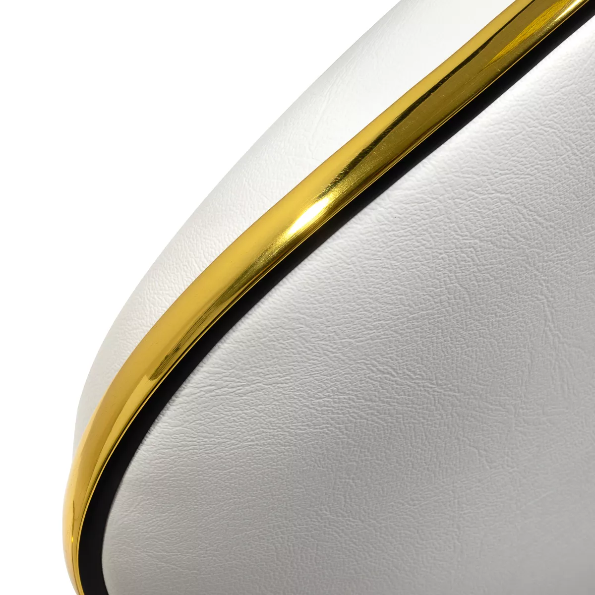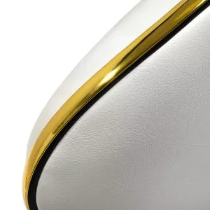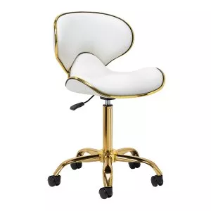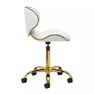 Pięcioramienna podstawa zapewnia stabilność, nawet podczas bardziej dynamicznych ruchów czy częstych zmian pozycji. Wyposażenie w wytrzymałe koła zapewnia wysoką mobilność, co pozwala na swobodne przemieszczanie się po salonie czy gabinecie. Obicie ze skóry syntetycznej w odcieniach bieli, które jest nie tylko trwałe, ale także łatwe do utrzymania w czystości. Estetyczne złote elementy dodają luksusowego charakteru i przyciągają wzrok. Wyjątkowe połączenie elegancji oraz komfortu czyni taboret niezastąpionym narzędziem w pracy każdego profesjonalisty.