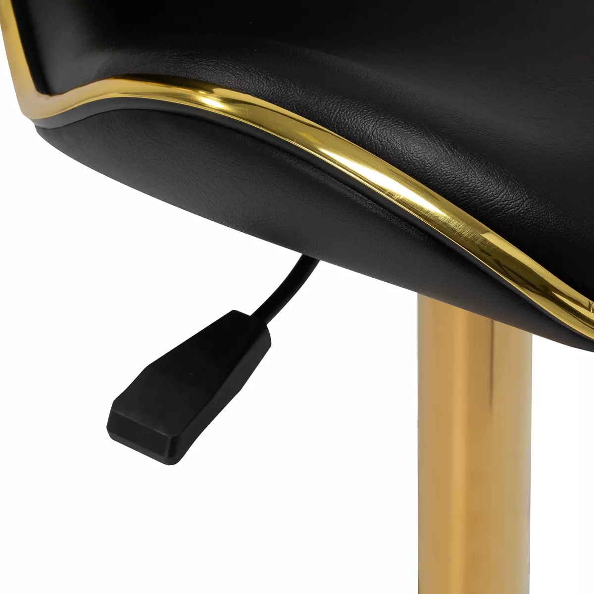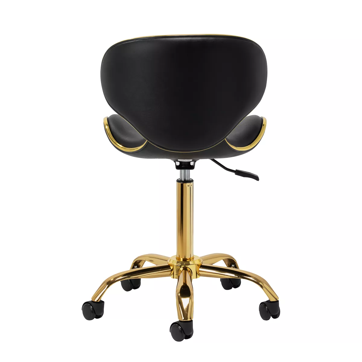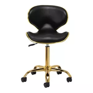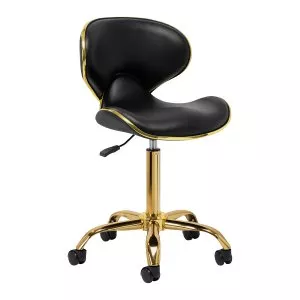 Pięcioramienna podstawa zapewnia stabilność, nawet podczas bardziej dynamicznych ruchów czy częstych zmian pozycji. Wyposażenie w wytrzymałe koła zapewnia wysoką mobilność, co pozwala na swobodne przemieszczanie się po salonie czy gabinecie. Obicie ze skóry syntetycznej w odcieniach czerni, które jest nie tylko trwałe, ale także łatwe do utrzymania w czystości. Estetyczne złote elementy dodają luksusowego charakteru i przyciągają wzrok. Wyjątkowe połączenie elegancji oraz komfortu czyni taboret niezastąpionym narzędziem w pracy każdego profesjonalisty.