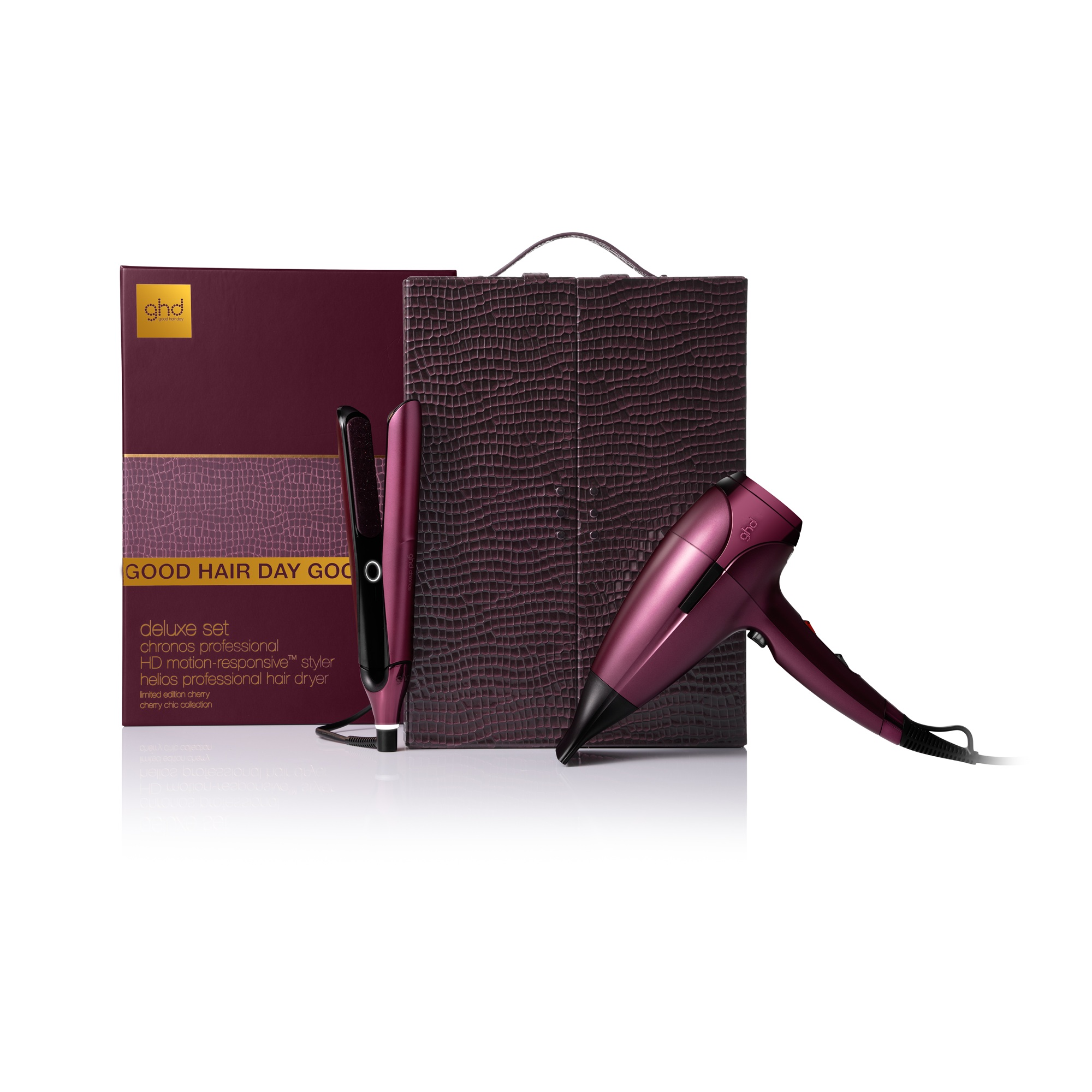 Odkryj luksusową stylizację na najwyższym poziomie z ghd Deluxe Set Cherry Chic – wyjątkowym zestawem prezentowym, który łączy innowacyjną prostownicę ghd chronos™ oraz profesjonalną suszarkę do włosów ghd helios®. Całość zapakowana jest w ekskluzywne etui, co czyni ten komplet doskonałym wyborem na prezent lub do własnego domowego salonu piękności.