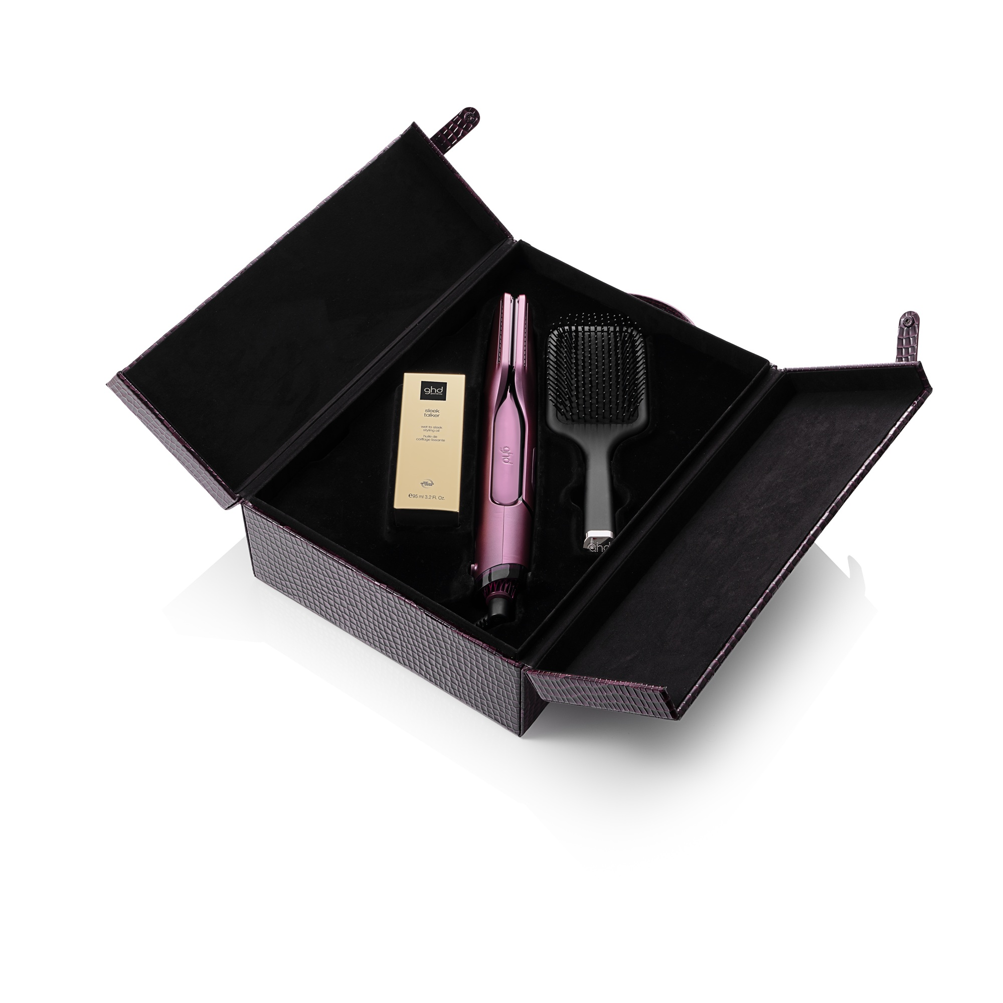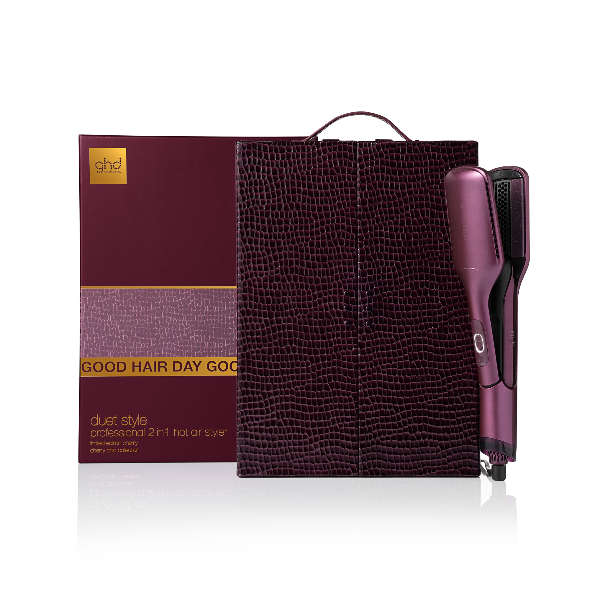 ZESTAW GHD CHERRY CHIC DUET STYLE™ zawiera: urządzenie DUET STYLE 2-W-1 suszarko-prostownicę, olejek ghd sleektalker, ghd płaską szczotkę oraz luksusowe etui.*