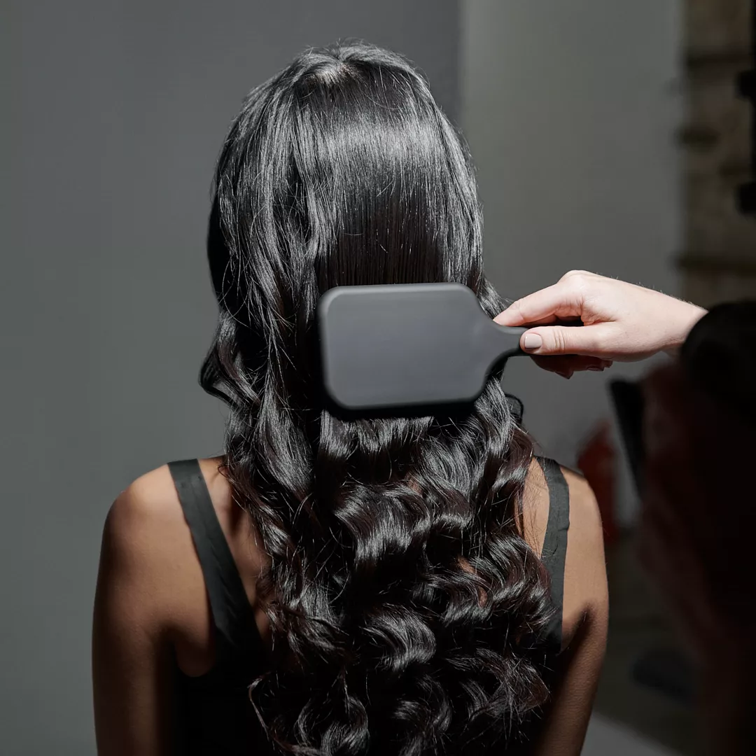 Aby osiągnąć idealnie gładką grzywkę, przeczesuj ją szczotką ghd The All-Rounded naprzemiennie w lewo i w prawo. Dla uzyskania najlepszych efektów, użyj suszarki ustawionej na niską temperaturę i średnią prędkość.