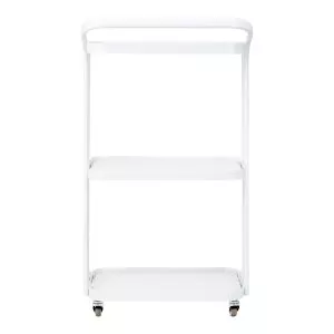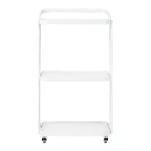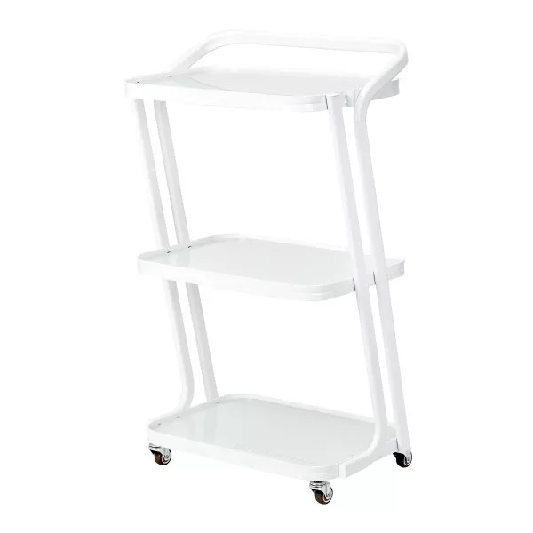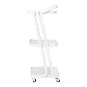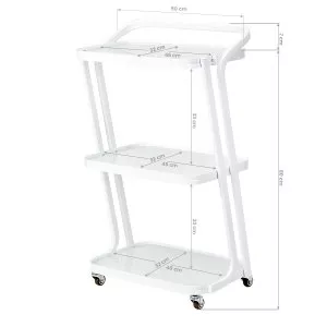 Prosta konstrukcja, stelaż z trwałego aluminium w odcieniach bieli oraz szklane półki sprawiają, że stolik jest zarówno estetyczny, jak i łatwy do utrzymania w czystości. Cztery kółka pozwalają na swobodne przestawianie, co znacząco ułatwia pracę w salonie, a solidne materiały gwarantują długotrwałą wytrzymałość i stabilność. Eleganckie wykończenie oraz ciekawie nachylony stelaż dodają mu wyjątkowego wyglądu, podnosząc estetykę każdego wnętrza.