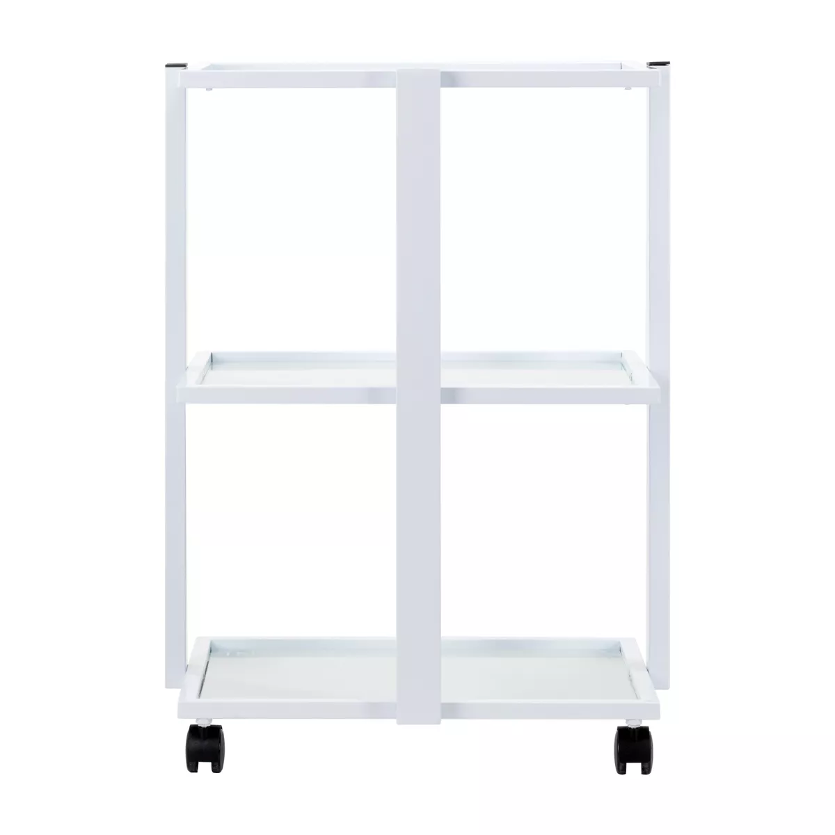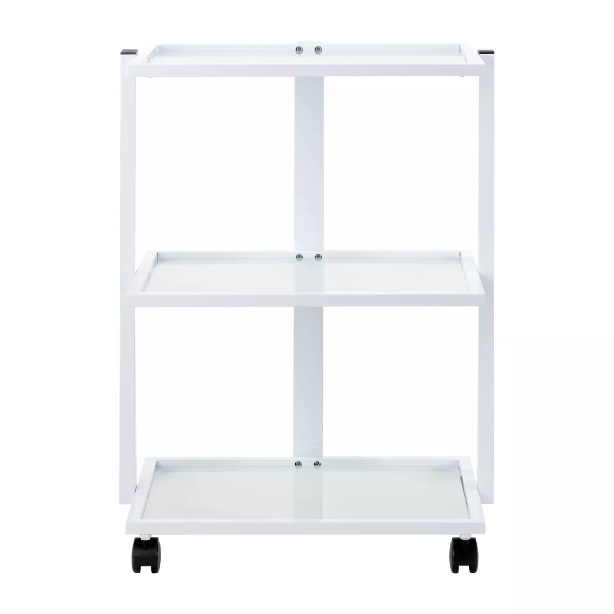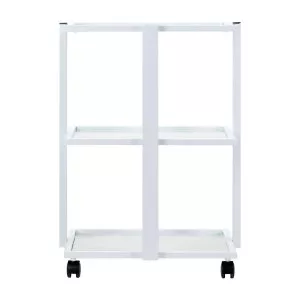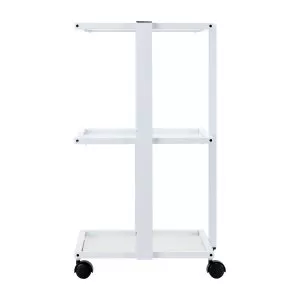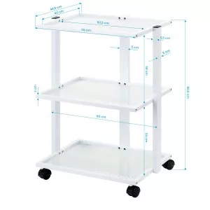 Prosta konstrukcja, stelaż z trwałego aluminium w odcieniach bieli oraz szklane półki łączą elegancję z praktycznością, zapewniając wytrzymałość i stabilność mebla. Gładkie powierzchnie ułatwiają utrzymanie stolika w czystości, a cztery kółka umożliwiają jego swobodne przestawianie, co zwiększa komfort pracy w salonie. Eleganckie wykończenie podkreśla profesjonalny charakter wnętrza. Na ramie stolika znajduje się specjalne miejsce, umożliwiające prosty montaż profesjonalnej lampy-lupy.