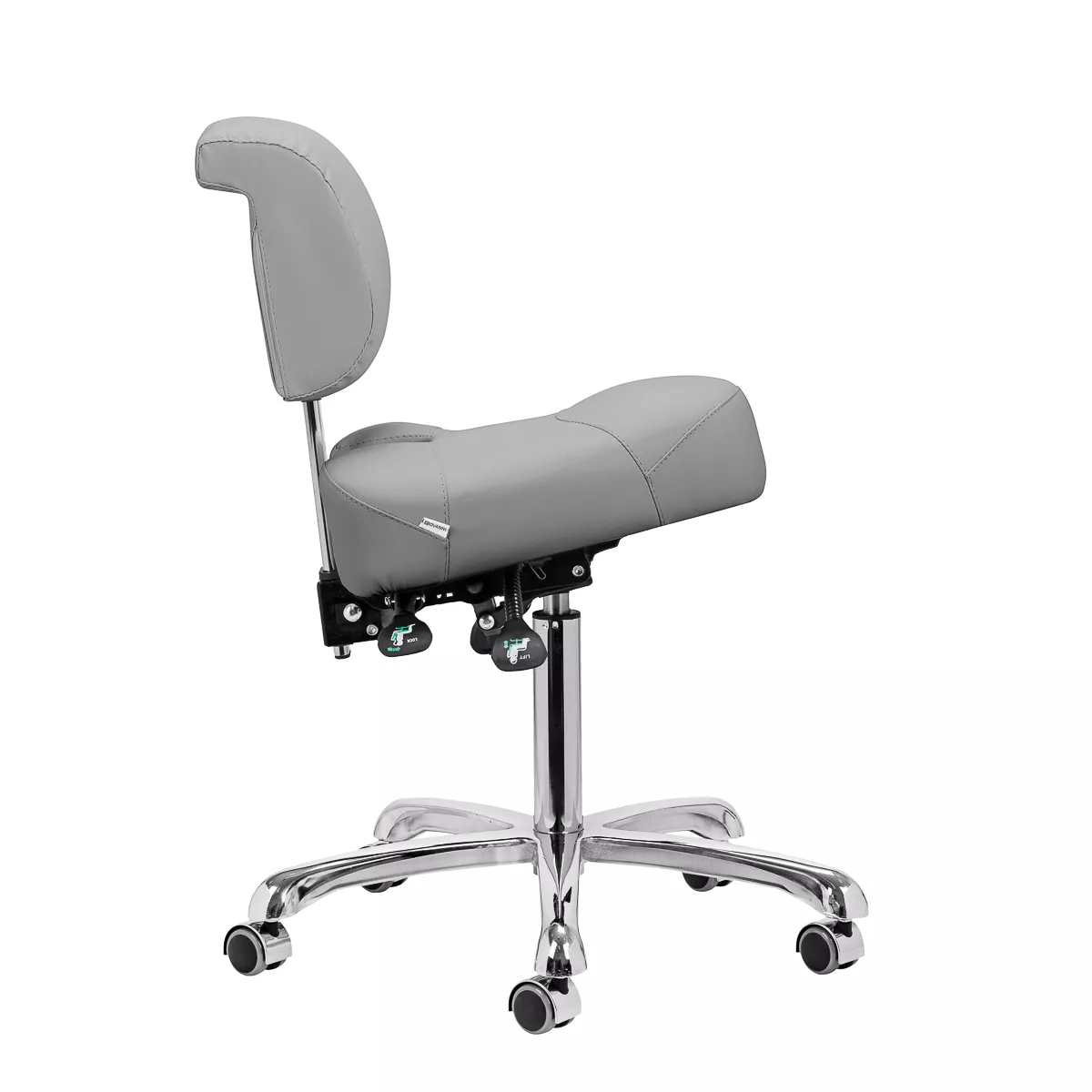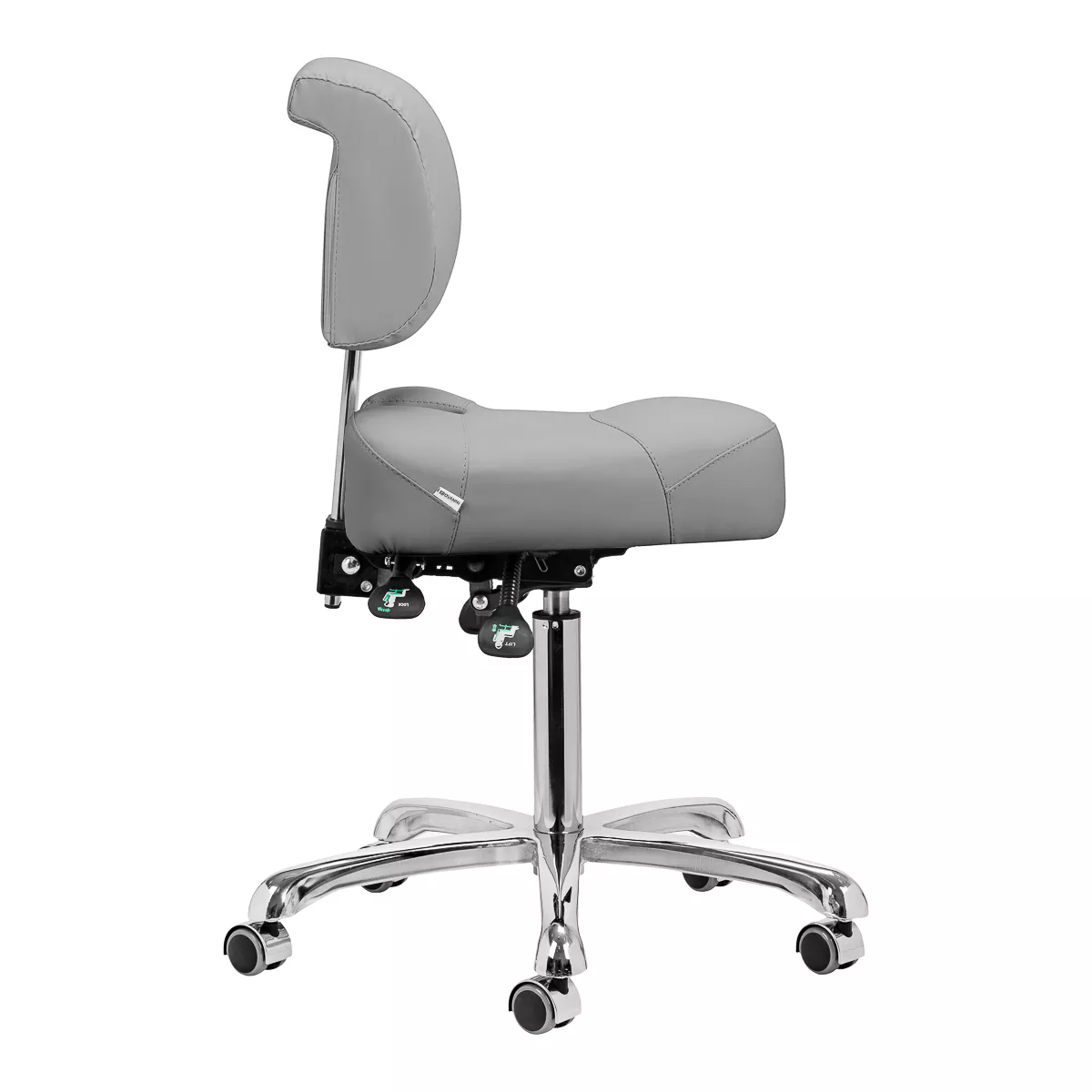 Możliwość regulacji wysokości w zakresie 55-72 cm pozwala przybrać odpowiednią pozycję w trakcie wykonywania usług. Perfekcyjnie wyprofilowane oparcie z regulacją zapewnia optymalne wsparcie dla odcinka lędźwiowego, minimalizując zmęczenie podczas długotrwałej pracy. Mechanizm pełnego obrotu, że praca staje się bardziej efektywna i wygodna. Taboret posiada również funkcję kołyski z możliwością blokady, co pozwala na ergonomiczne ustawienie ciała. Siedzisko zapewnia regulację pochylenia oraz wysokości dzięki siłownikom gazowym. Dodatkowo wysokość oparcia można manualnie dostosować dla pełnej wygody użytkowania.