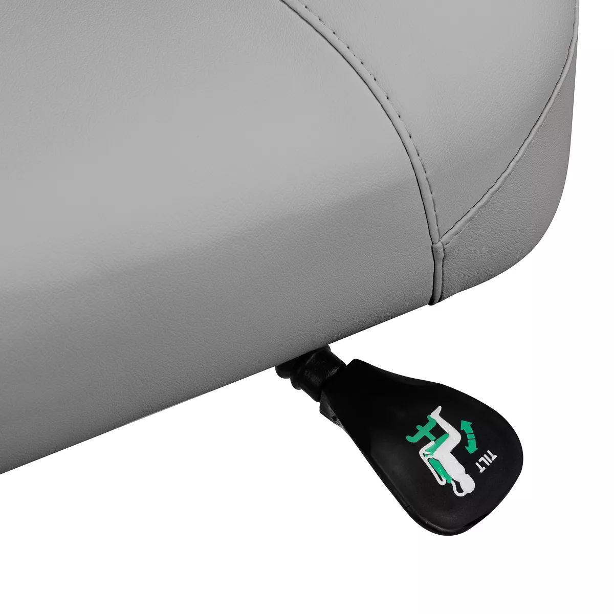 Pięcioramienna, solidna podstawa zapewnia wyjątkową stabilność taboretu, nawet podczas intensywnego użytkowania. Gumowane kółka umożliwiają jego łatwe i płynne przemieszczanie, nie niszcząc przy tym podłogi. Krzesło cechuje się trwałością i stabilnością, a jego obicie z wysokiej jakości imitacji skóry w odcieniach szarości jest odporne na wilgoć i łatwe do utrzymania w czystości, co dodatkowo podnosi komfort użytkowania.