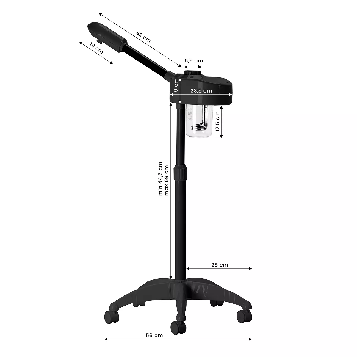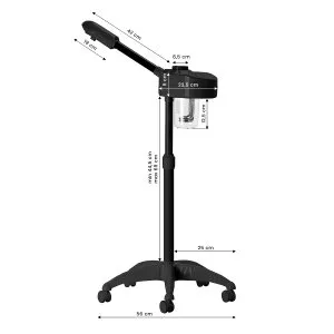 Wapozon wykonano z trwałego tworzywa sztucznego w odcieniach czerni, co sprawia, że urządzenie łatwo utrzymać w czystości. Statyw wyposażony jest w regulację wysokości w zakresie 44,5-69 cm, co pozwala na ustawienie sprzętu na odpowiednim poziomie, by zapewnić komfort pracy osobie wykonującej zabieg. Dyszę wapozonu można obracać, co zwiększa zakres możliwego ustawienia. Pięcioramienna podstawa z kółkami poprawia mobilność, ułatwiając swobodne przestawianie urządzenia.