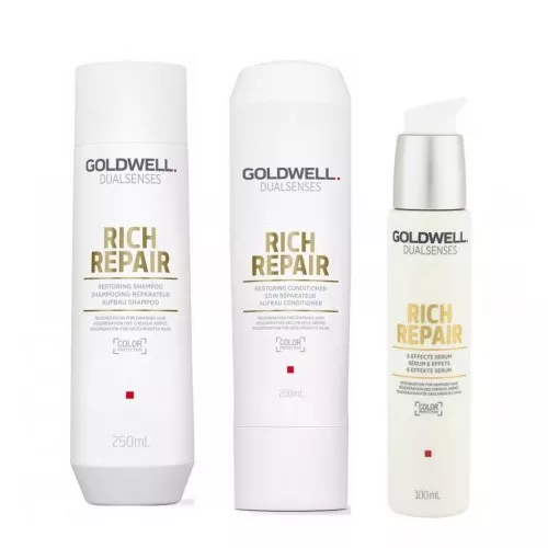 ZestawGoldwell Dualsenses Rich Repair powstał z myślą o pielęgnacji włosów suchych i zniszczonych. Kosmetyki wnikają głęboko i regenerują nawet mocno zniszczone włosy, dodając im pięknego blasku. Technologia FadeStopFormula zabezpiecza włosy farbowane przed wypłukiwaniem się koloru. Ponadto IntraLipid Complex odbudowuje włosy od wewnątrz, uzupełnia braki lipidowe i zapewnia doskonałe wzmocnienie.