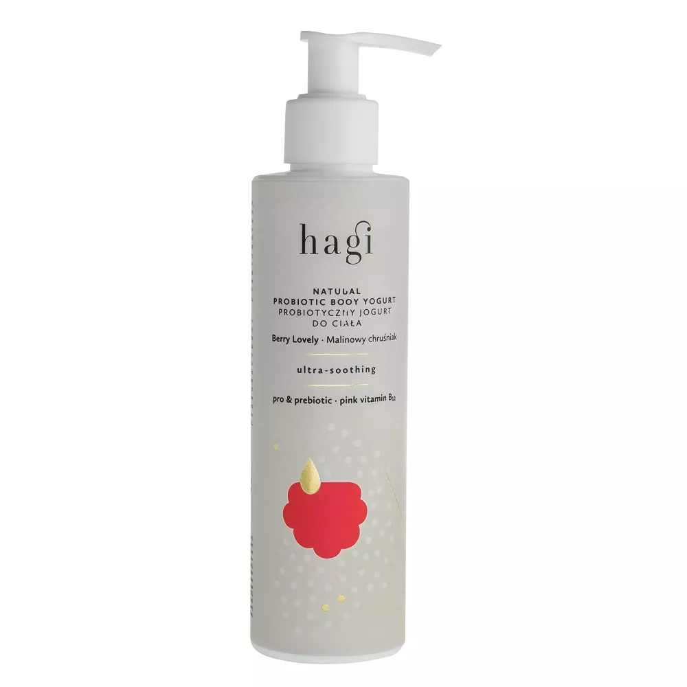 Hagi Probiotyczny jogurt do ciała Malinowy Chruśniak to doskonałe rozwiązanie dla osób poszukujących ukojenia, ochrony i nawilżenia skóry. Jego lekka, kremowo-żelowa konsystencja zapewnia natychmiastowy efekt nawodnienia oraz szybkie wchłanianie. Produkt jest wzbogacony o łagodzący aloes, d-pantenol, kojącą różową witaminę B12, olej z pestek malin oraz kompleks ekstraktów z malin, jeżyn i truskawek. Idealnie nadaje się do pielęgnacji skóry po kąpielach słonecznych i wodnych. Dzięki zawartości pre- i probiotyków wspiera naturalny mikrobiom skóry, a jego naturalnie różowy kolor pochodzi z witaminy B12.