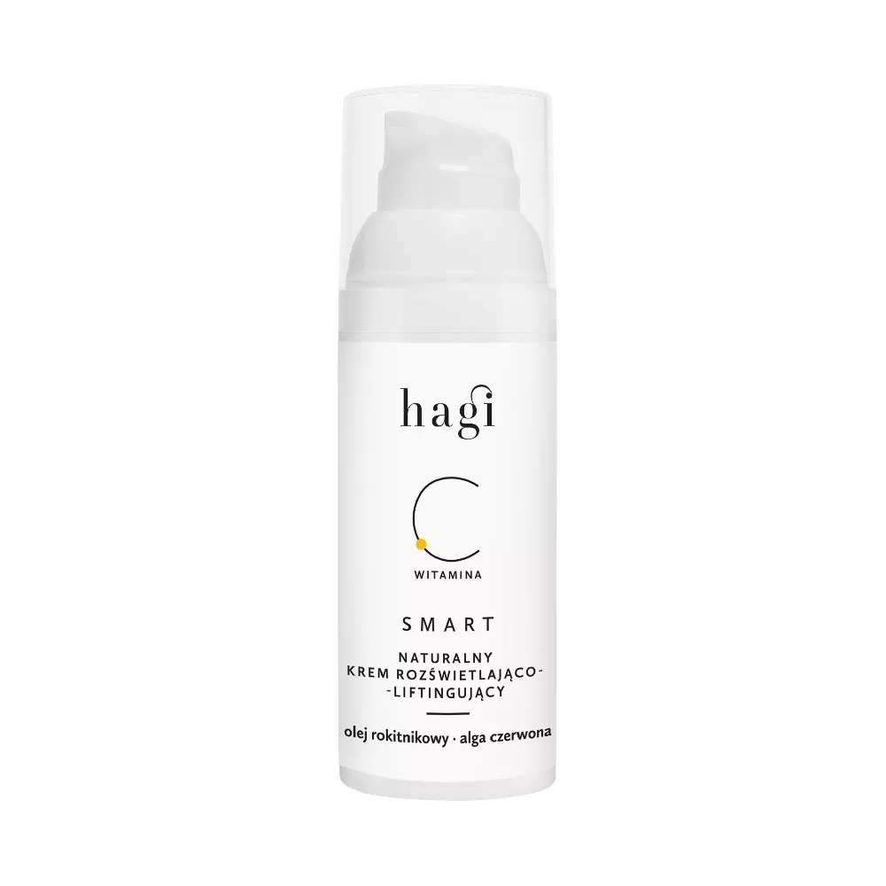 Hagi Smart C krem rozświetlający do twarzy 50ml to lekki krem liftingujący na dzień, który zawiera stabilną formę witaminy C. Ten silny antyoksydant chroni skórę, jednocześnie oferując bogactwo składników aktywnych, które doskonale odżywiają i uelastyczniają skórę. Jego unikalna formuła zawiera kompleks liftingujący z makroalgi czerwonej oraz drzewa Tara, a także ekstrakt z korzenia cykorii. Dodatek hydrolatu cytrynowego oraz pigmentu perłowego rozjaśnia skórę, nadając jej zdrowy blask przy codziennej pielęgnacji. Olej rokitnikowy, będący źródłem naturalnej witaminy C, zapewnia pielęgnację skóry w każdym wieku.