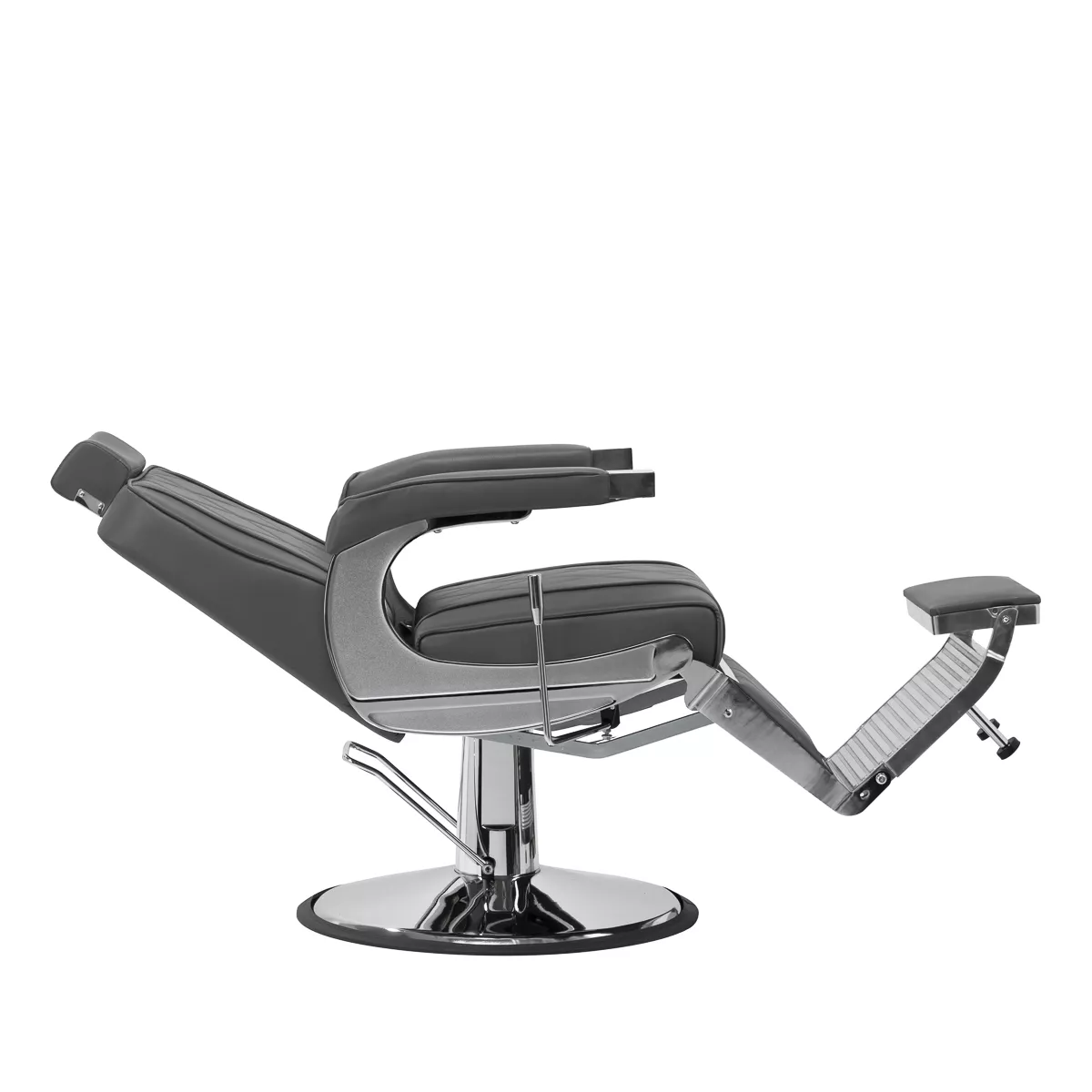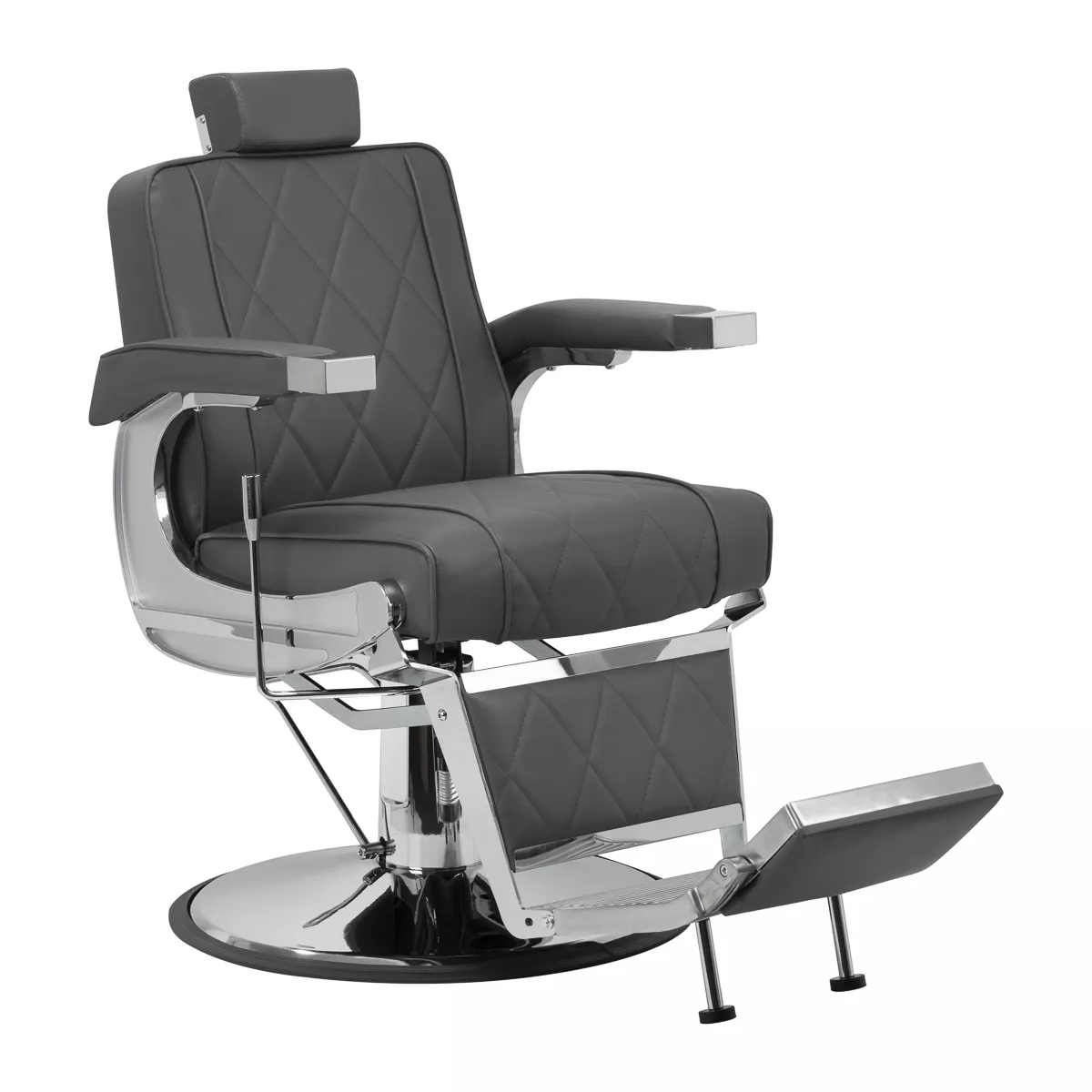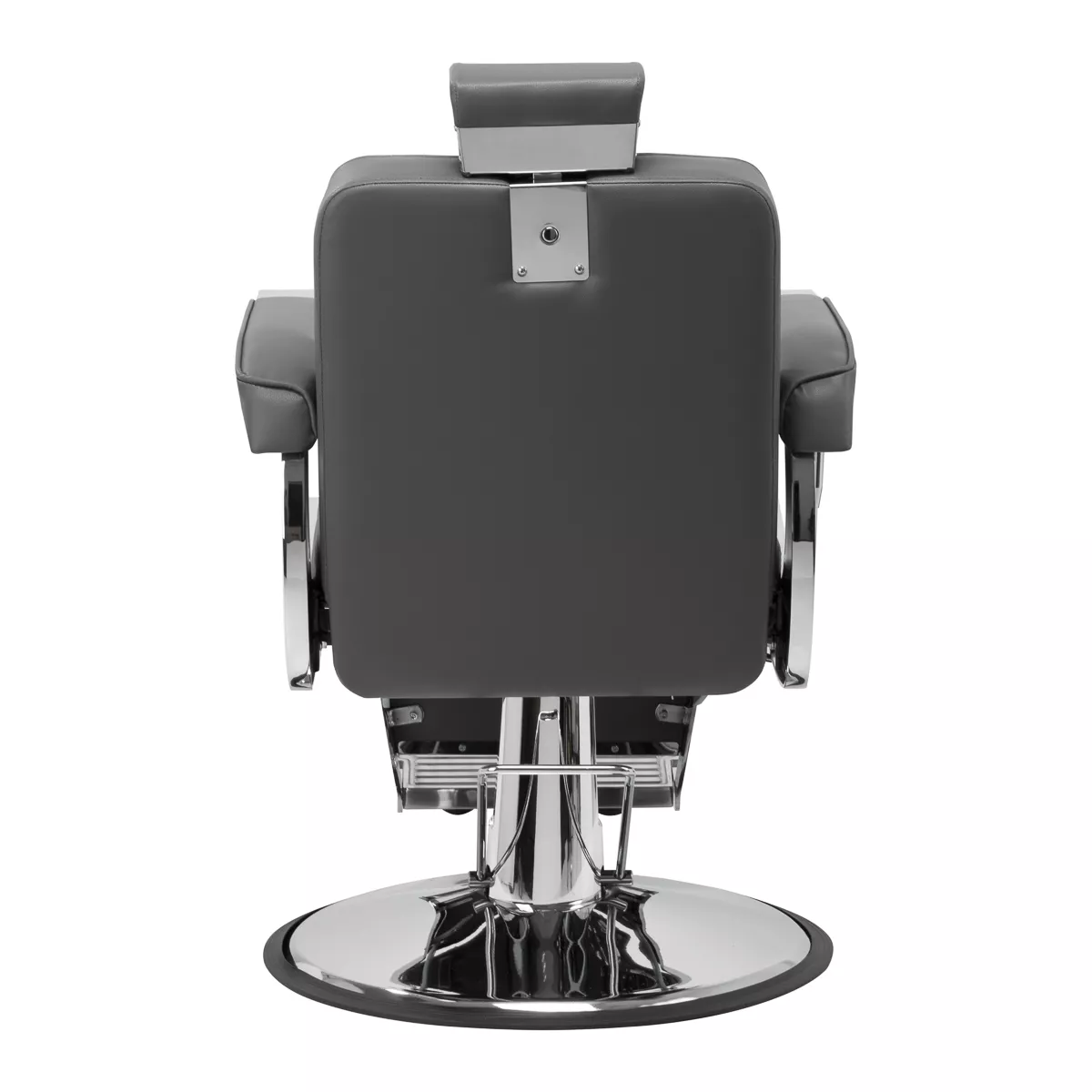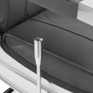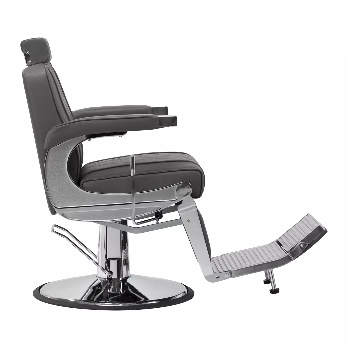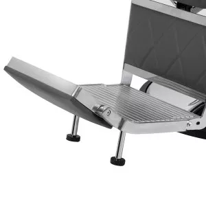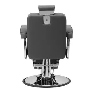 Solidna konstrukcja okrągłej podstawy zapewnia stabilność oraz wysoki komfort użytkowania. Wypełnienie siedziska z odpornej na odkształcenia pianki oraz obicie wykonane z przyjemnej w dotyku skóry syntetycznej o matowym wykończeniu zapewniają trwałość mebla oraz jego komfortowe użytkowanie przez długi czas. Stylowe przeszycia na tapicerce nadają fotelowi charakteru, przywodząc na myśl design motoryzacyjny, co podkreśla jego elegancki wygląd. Sprawiają również, że sprzęt jest odporny na wilgoć, wytrzymały oraz łatwy do czyszczenia. Pokrycie w odcieniach szarości nadaje mu wyjątkowego charakteru, a minimalistyczny styl pozwala mu wpasować się w wystrój każdego salonu barberskiego.