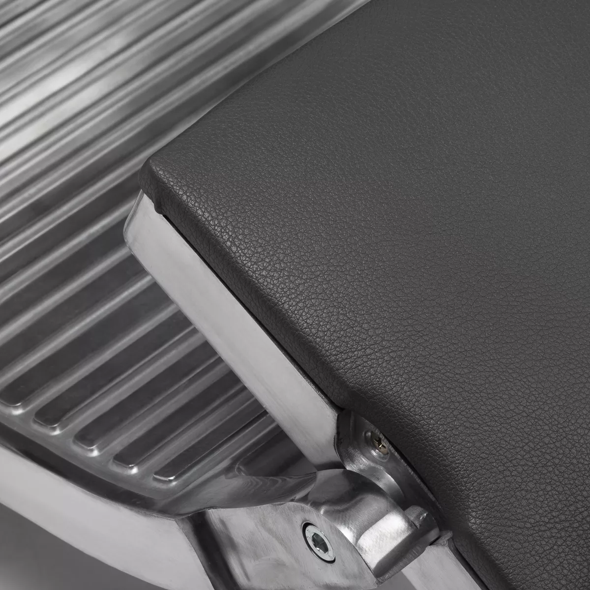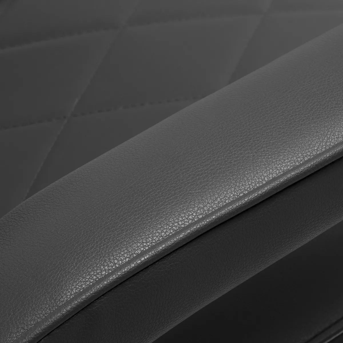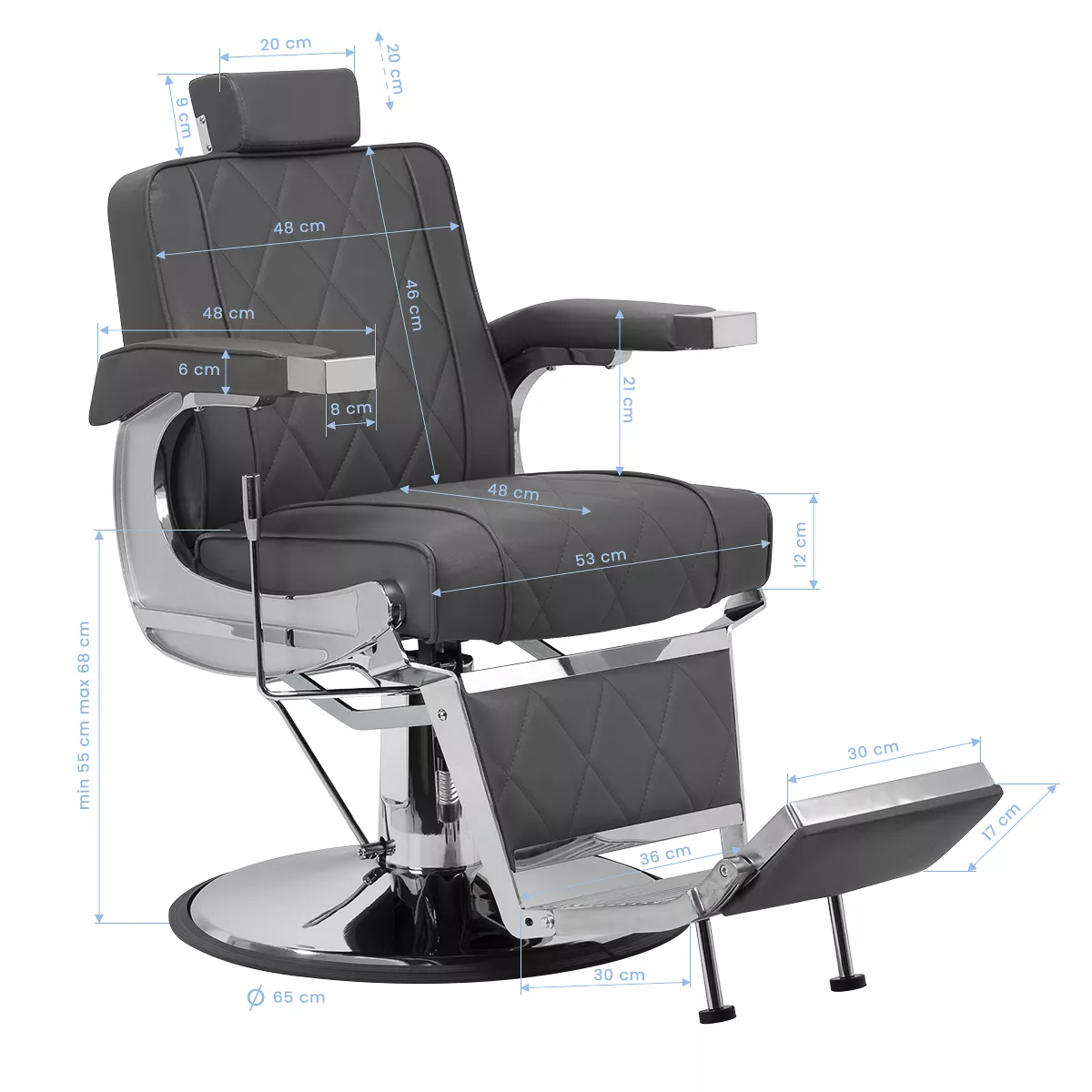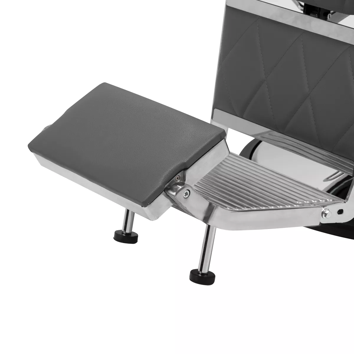 Solidna konstrukcja okrągłej podstawy zapewnia stabilność oraz wysoki komfort użytkowania. Wypełnienie siedziska z odpornej na odkształcenia pianki oraz obicie wykonane z przyjemnej w dotyku skóry syntetycznej o matowym wykończeniu zapewniają trwałość mebla oraz jego komfortowe użytkowanie przez długi czas. Stylowe przeszycia na tapicerce nadają fotelowi charakteru, przywodząc na myśl design motoryzacyjny, co podkreśla jego elegancki wygląd. Sprawiają również, że sprzęt jest odporny na wilgoć, wytrzymały oraz łatwy do czyszczenia. Pokrycie w odcieniach szarości nadaje mu wyjątkowego charakteru, a minimalistyczny styl pozwala mu wpasować się w wystrój każdego salonu barberskiego.