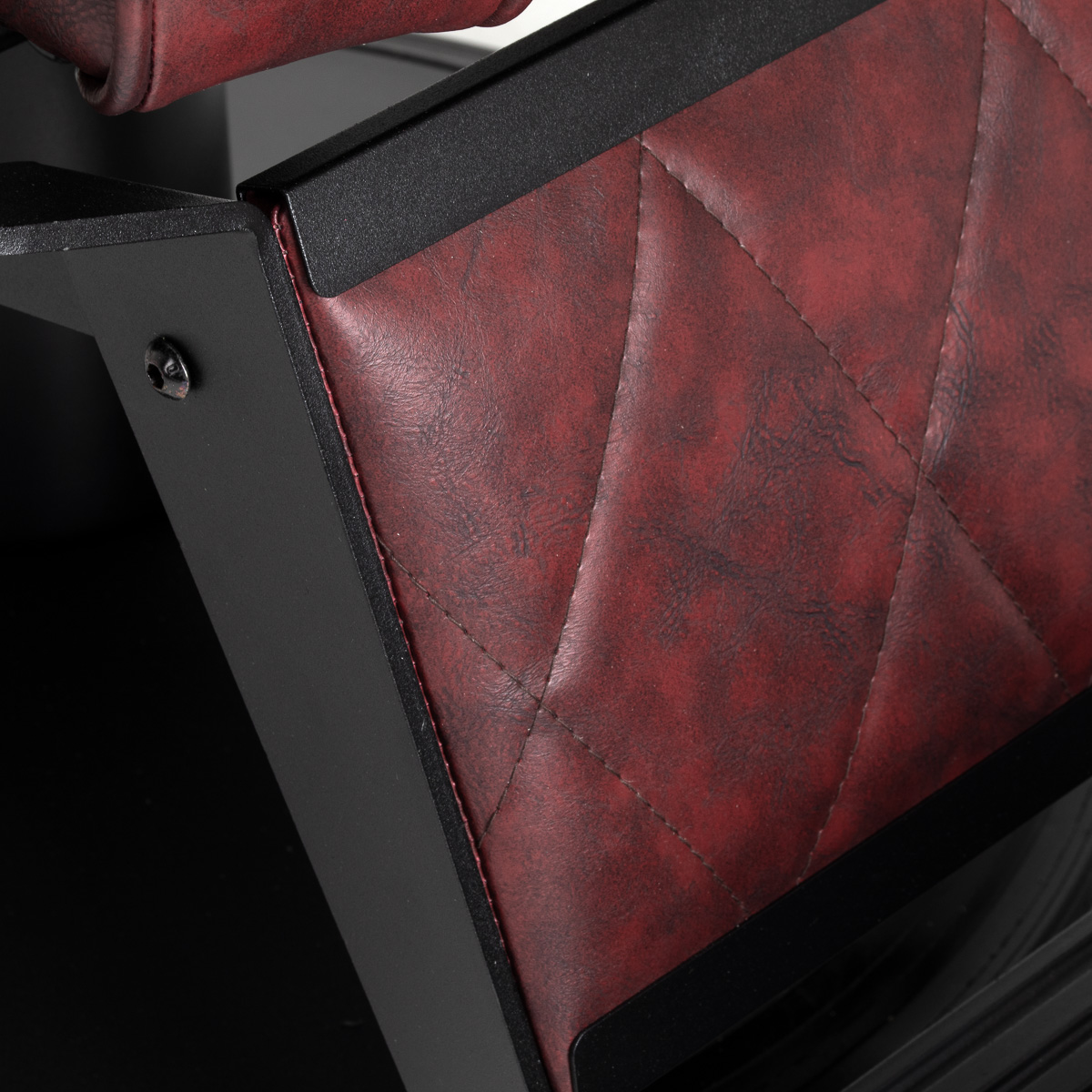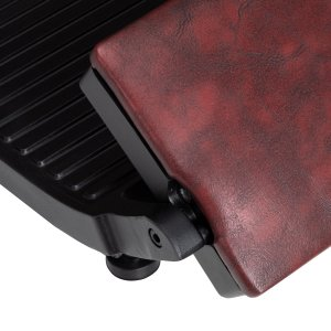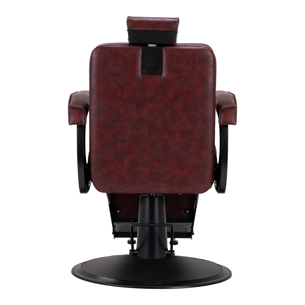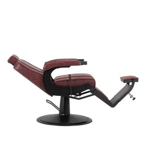 Solidna konstrukcja okrągłej podstawy zapewnia stabilność oraz wysoki komfort użytkowania. Wypełnienie siedziska z odpornej na odkształcenia pianki oraz obicie wykonane z przyjemnej w dotyku skóry syntetycznej o matowym wykończeniu zapewniają trwałość mebla oraz jego komfortowe użytkowanie przez długi czas. Stylowe przeszycia na tapicerce nadają fotelowi charakteru, przywodząc na myśl design motoryzacyjny, co podkreśla jego elegancki wygląd. Sprawiają również, że sprzęt jest odporny na wilgoć, wytrzymały oraz łatwy do czyszczenia. Pokrycie w odcieniach bordo nadaje mu wyjątkowego charakteru, a minimalistyczny styl pozwala mu wpasować się w wystrój każdego salonu barberskiego.