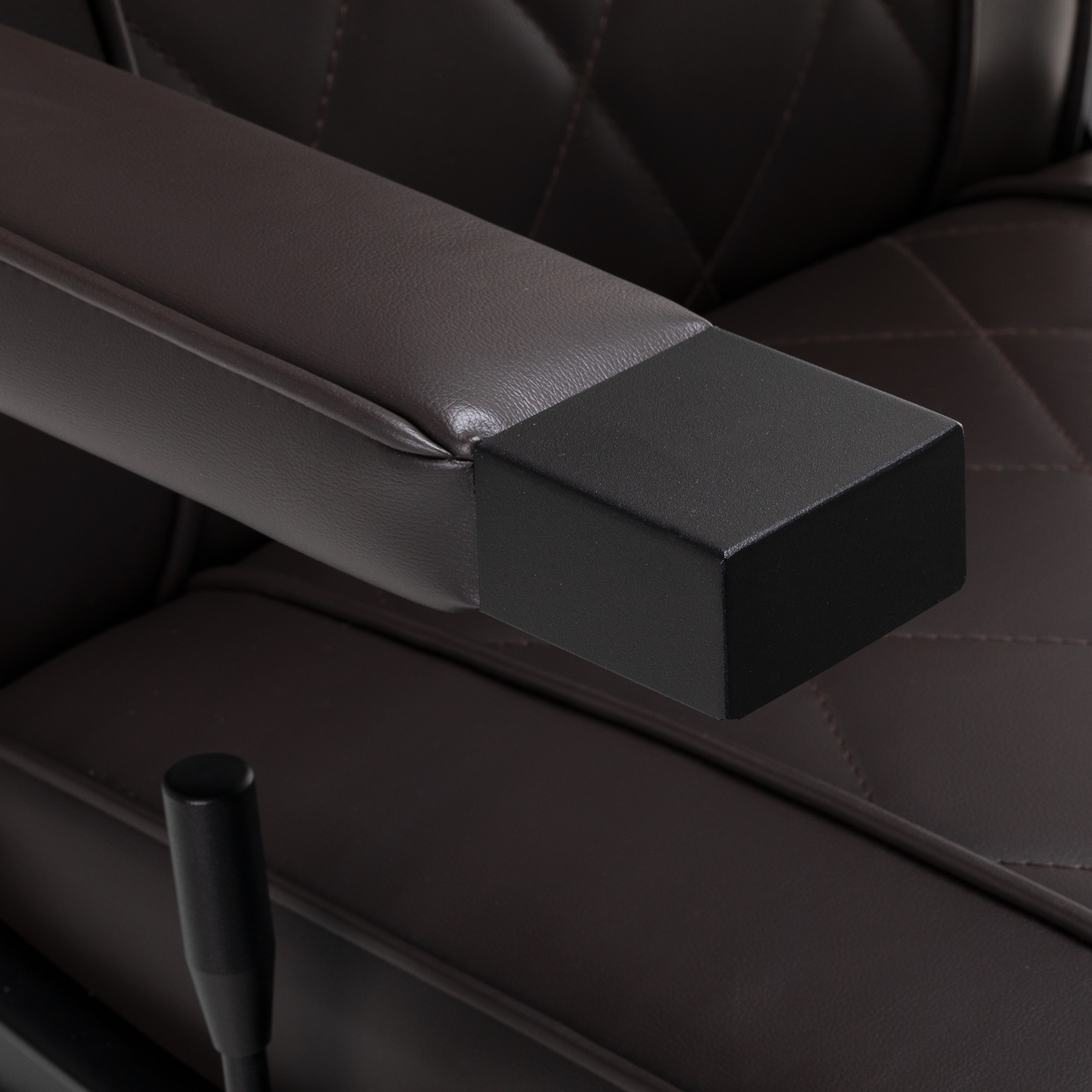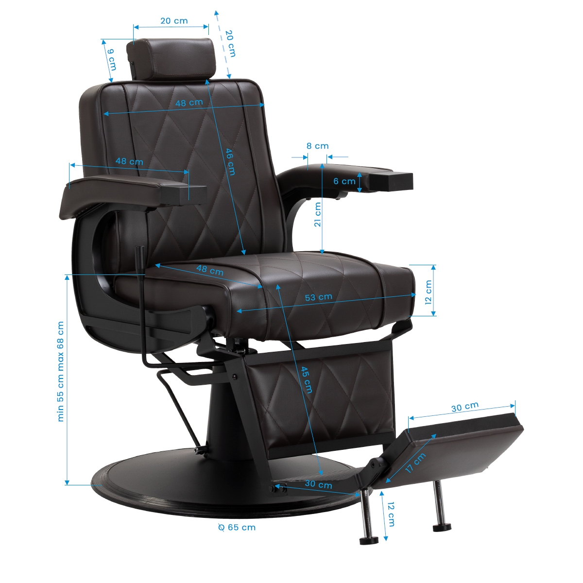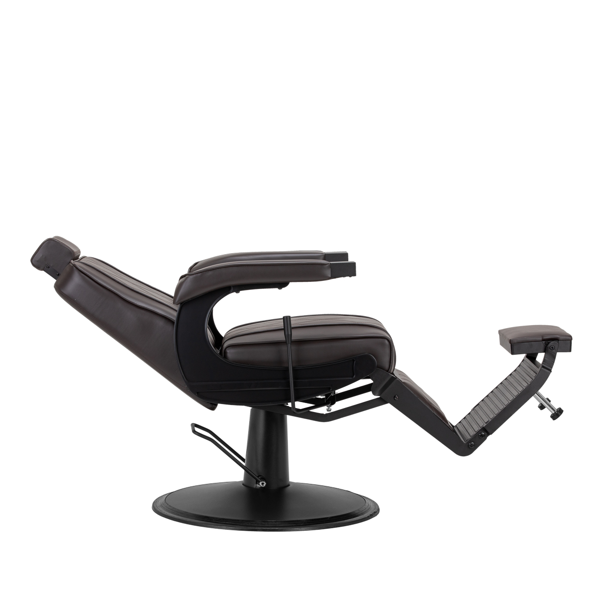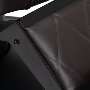 Solidna konstrukcja okrągłej podstawy zapewnia stabilność oraz wysoki komfort użytkowania. Wypełnienie siedziska z odpornej na odkształcenia pianki oraz obicie wykonane z przyjemnej w dotyku skóry syntetycznej o matowym wykończeniu zapewniają trwałość mebla oraz jego komfortowe użytkowanie przez długi czas. Stylowe przeszycia na tapicerce nadają fotelowi charakteru, przywodząc na myśl design motoryzacyjny, co podkreśla jego elegancki wygląd. Sprawiają również, że sprzęt jest odporny na wilgoć, wytrzymały oraz łatwy do czyszczenia. Pokrycie w odcieniach brązu nadaje mu wyjątkowego charakteru, a minimalistyczny styl pozwala mu wpasować się w wystrój każdego salonu barberskiego.