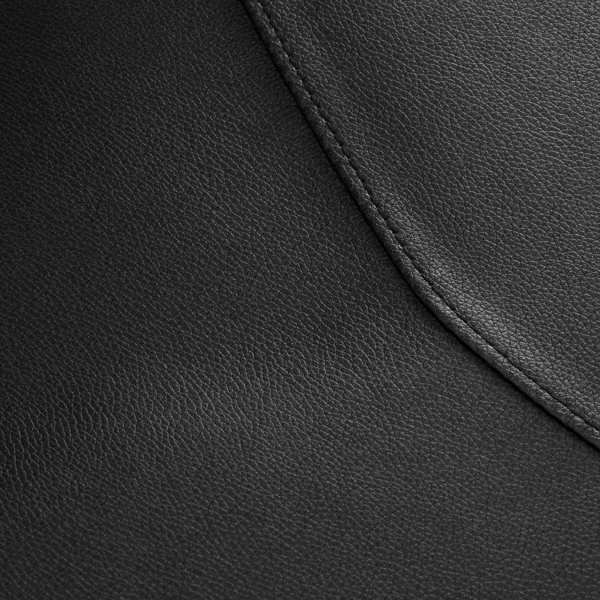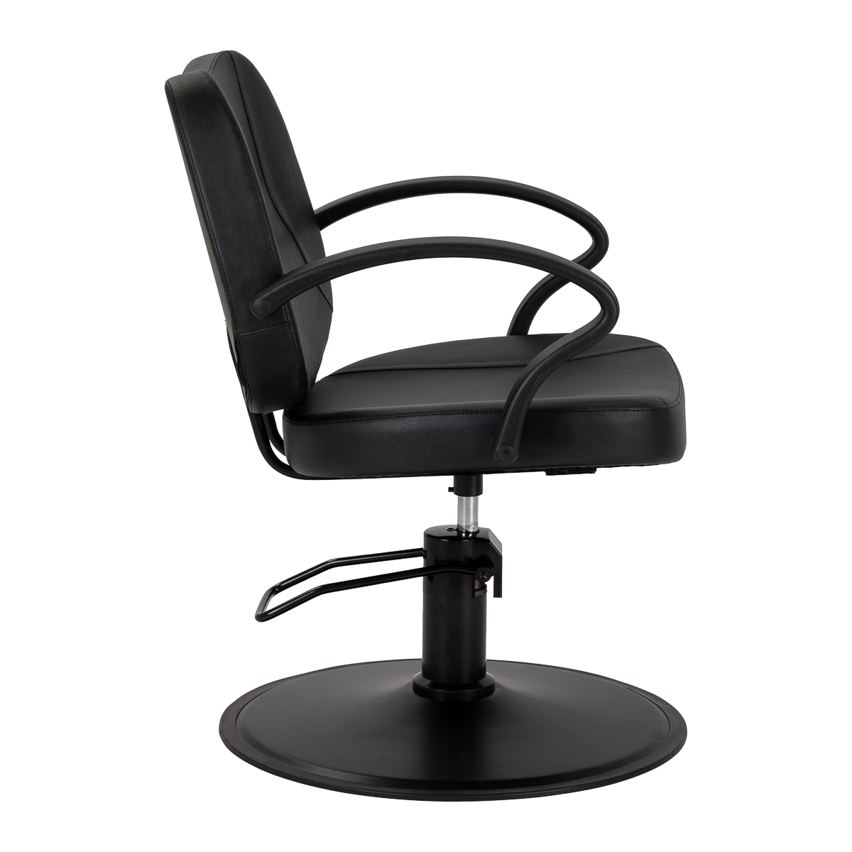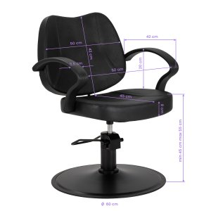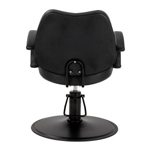 Wytrzymały korpus oraz skóra syntetyczna w odcieniach czerni zapewniają odporność na wilgoć, solidność oraz trwałość. Okrągła podstawa w odcieniach czerni gwarantuje stabilność i wytrzymałość. Opływowa linia górnej części oparcia dodaje lekkości wizualnej, podkreślając nowoczesny charakter fotela, a staranne detale świadczą o wysokiej jakości wykonania. Minimalistyczna czerń w połączeniu z estetycznymi przeszyciami sprawia, że fotel doskonale komponuje się z różnymi stylami wnętrz salonów fryzjerskich, wprowadzając elegancki i nowoczesny akcent.