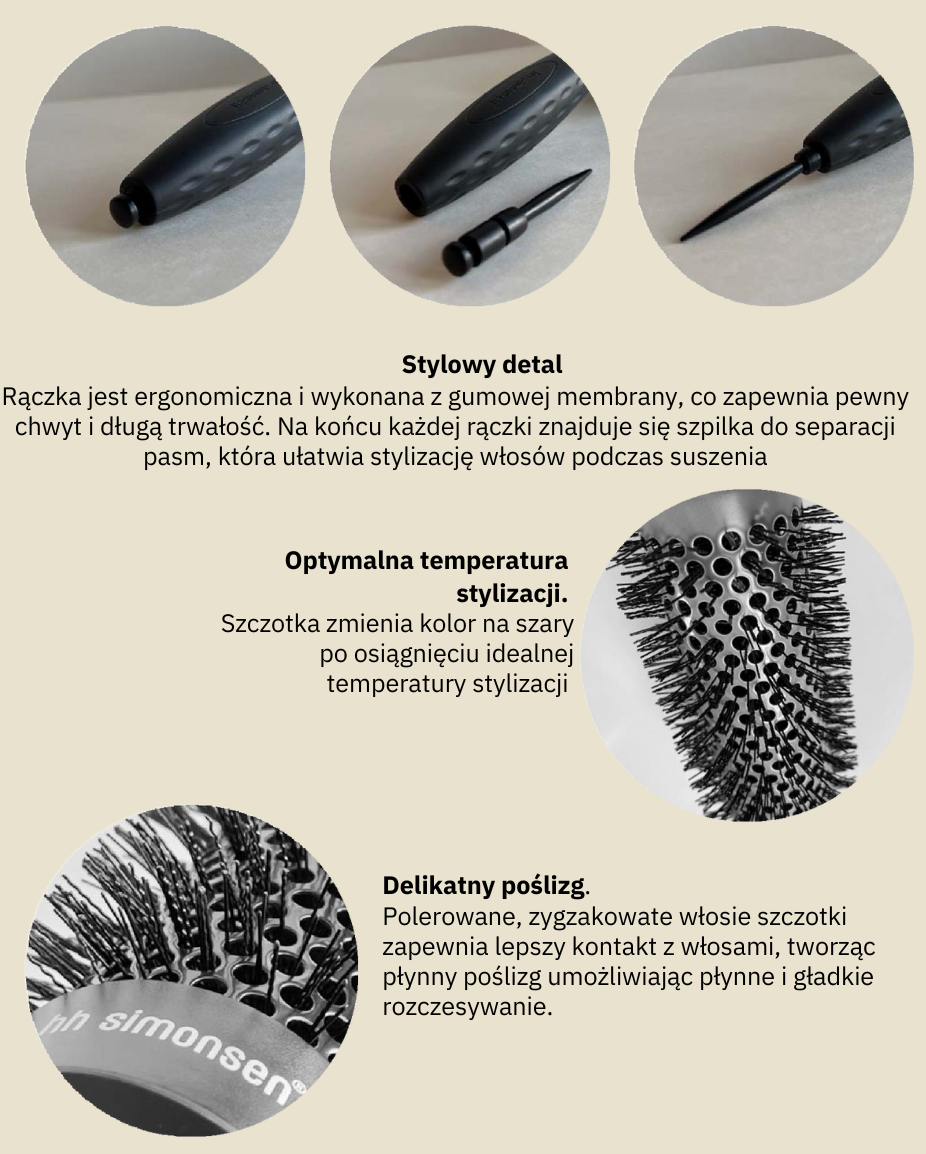 - Inteligentna powłoka zmieniająca kolor – gdy temperatura szczotki przekroczy 60°C, czarna powierzchnia zmienia kolor na szary, sygnalizując optymalny poziom nagrzania i chroniąc włosy przed przegrzaniem.