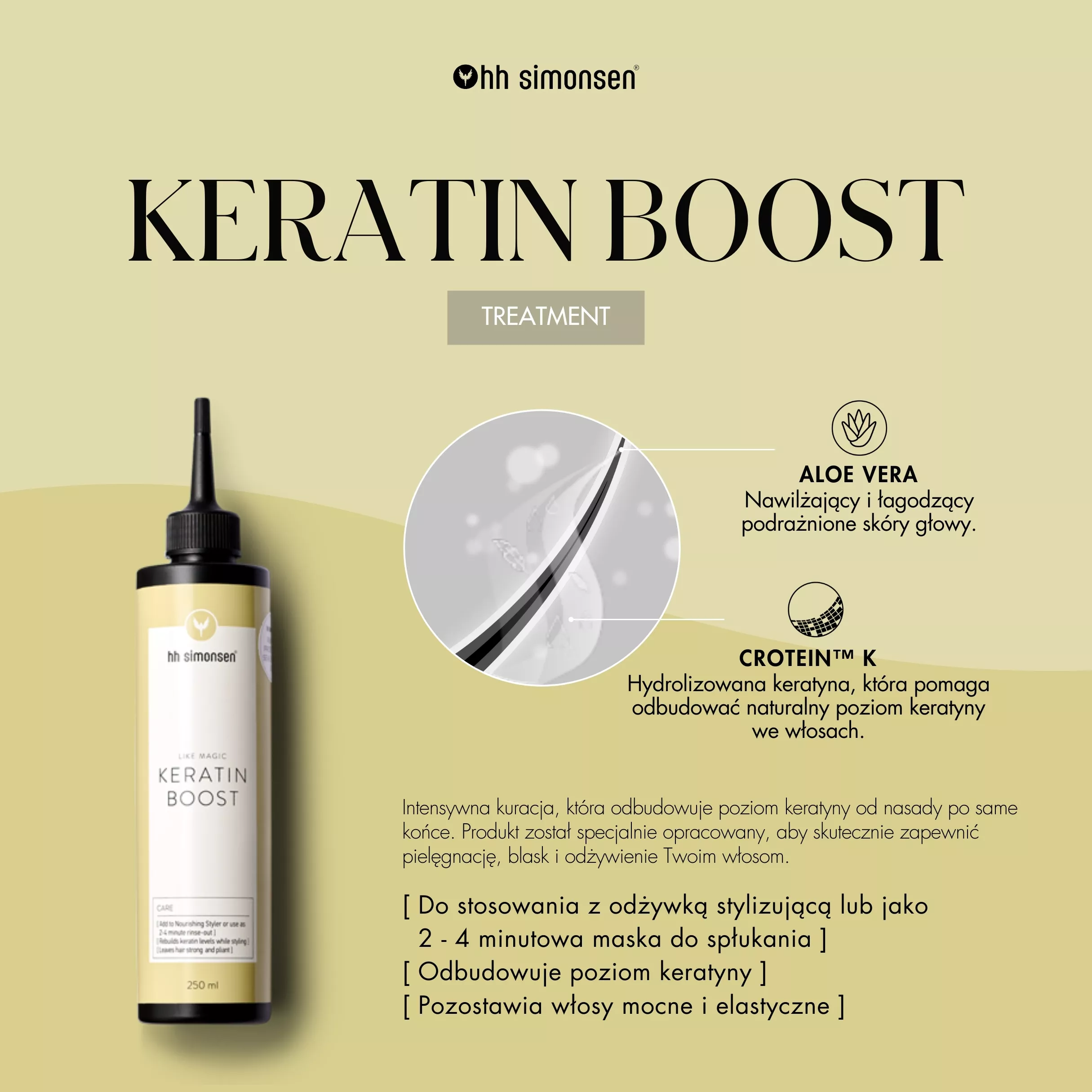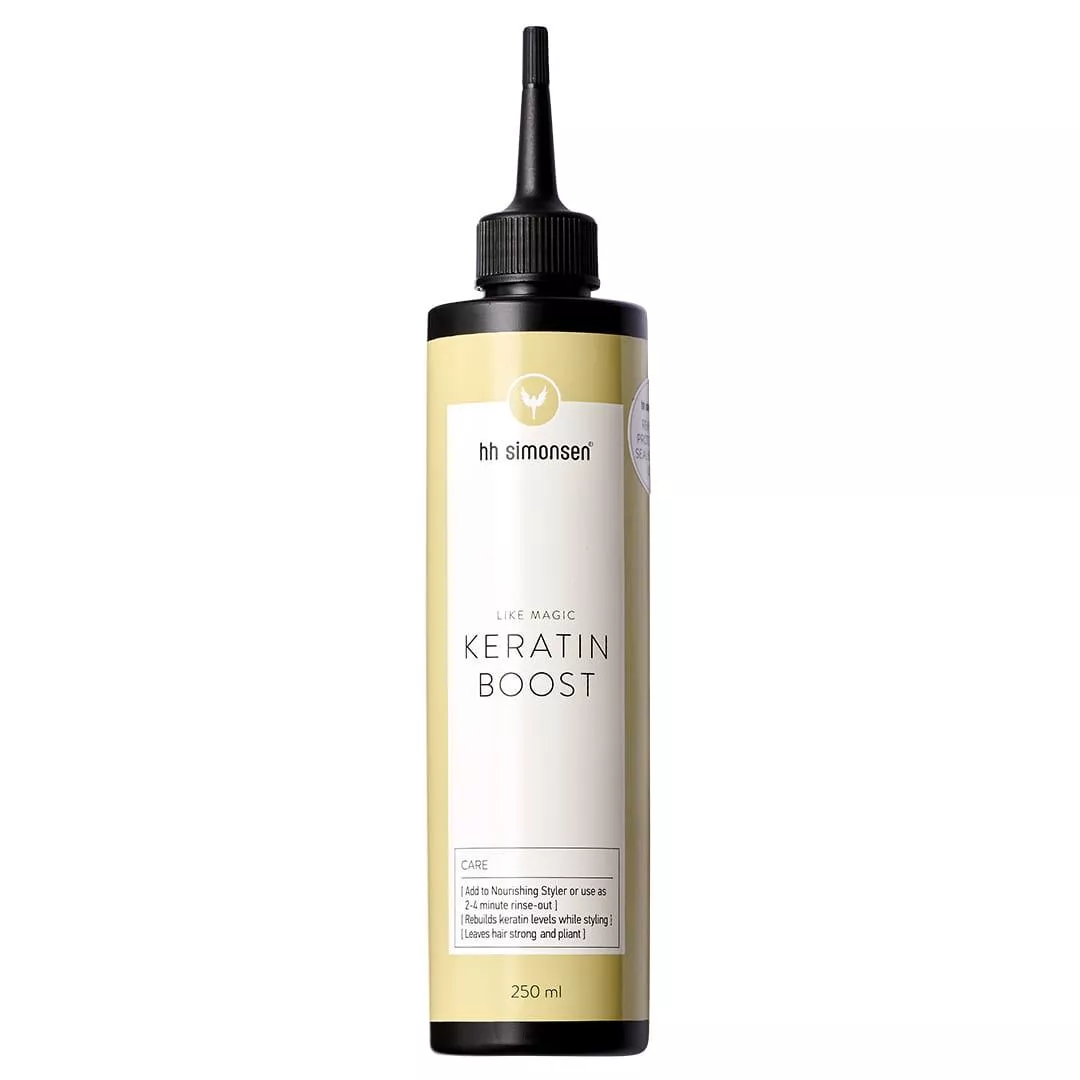 HH Simonsen Keratin Boost można stosować z prostownicą Nourishing Styler lub jako 2-4-minutową kurację na mokre włosy przed nałożeniem odżywki.