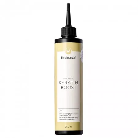 Odkryj tajemnicę salonowego blasku z HH Simonsen Keratin Boost, keratynowym płynem do prostownicy o pojemności 250 ml. Ten wyjątkowy produkt został stworzony, aby zapewnić Twoim włosom jednoczesną pielęgnację i stylizację, gwarantując efekt pięknych, zdrowych i elastycznych pasm.