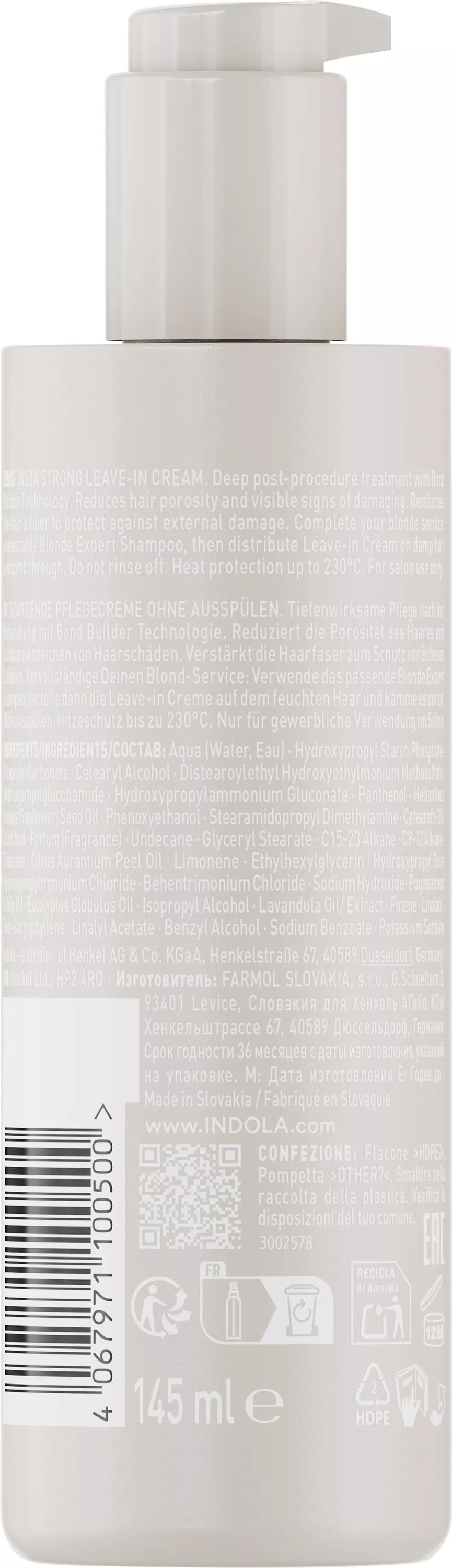 Odkryj moc regeneracji z Indola Blonde Expert InstaStrong – innowacyjnym kremem bez spłukiwania, stworzonym specjalnie dla włosów blond. Zapewnia on spektakularny efekt i zdrowy wygląd rozjaśnianych włosów. Dzięki głębokim formułom regenerującym, Twoje pasma odzyskają gładkość, elastyczność i naturalny blask. Uszczelnij powierzchnię włosa, aby Twoja blond stylizacja zyskała perfekcyjne wykończenie i wyjątkową trwałość. Ciesz się promiennym i świeżym blondem każdego dnia.