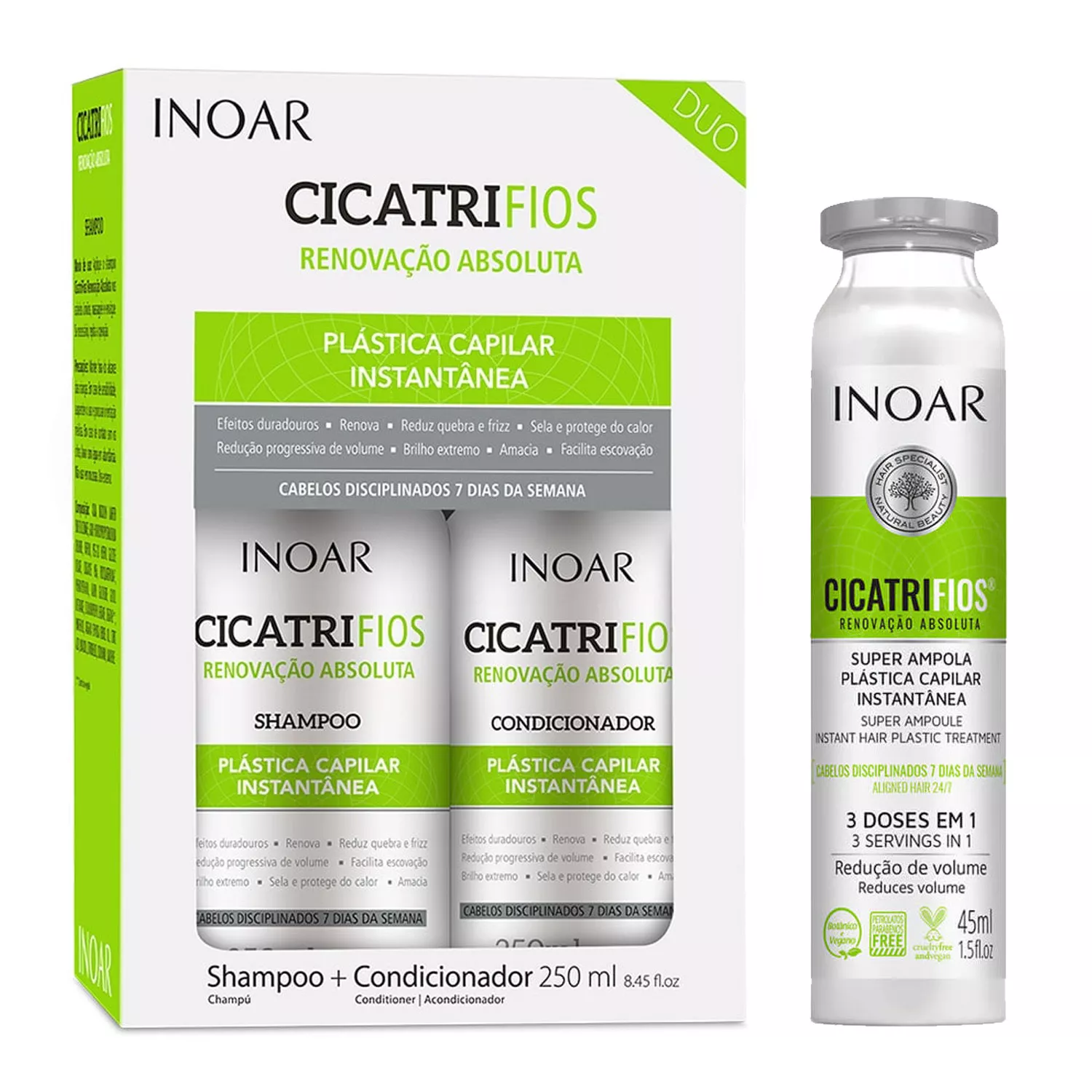 Kosmetyki do włosów INOAR CcatriFios to system do regeneracji włosó zniszczonych zabiegami chemicznymi. Kosmetyki odbudowują włosy i poprawiają ich strukturę, dzięki czemu są mocne, elastyczne i ładnie się układają. W składzie znajdują się: olejek arganowy, olejek z kiełków pszenicy, keratyna, proteiny roślinne. CicatriFios Super Ampola to ampułka do laminacji i odbudowy struktury włosów. Wypełnia pasma składnikami aktywnymi, a następnie zamyka łuski włosów, zapewniając długotrwały efekt odżywienia i ekstremalny blask.