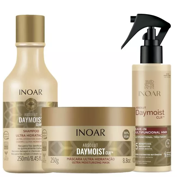 Szampon INOAR Absolut Daymoist CLR przeznaczony jest do pielęgnacji włosów suchych. Świetnie wnika do wnętrza i chroni przed utratą wilgoci. Kosmetyk ten to świetna propozycja dla włosów po inwazyjnych zabiegach chemicznych. Wielofunkcyjna odżywka Absolut DayMoist CLR leave-in w formie wygodnego spray’u. Lekka formuła na bazie ekstraktów i olejków roślinnych, wnika w głąb włosów, zapewniając natychmiastową regenerację. Maska nawilżająca INOAR Absolut Daymoist CLR dedykowana jest włosom suchym oraz po zabiegach chemicznych. W składzie kosmetyku znajdziesz ekstrakty roślinne, które są gwarantem odpowiedniego poziomu nawilżenia.