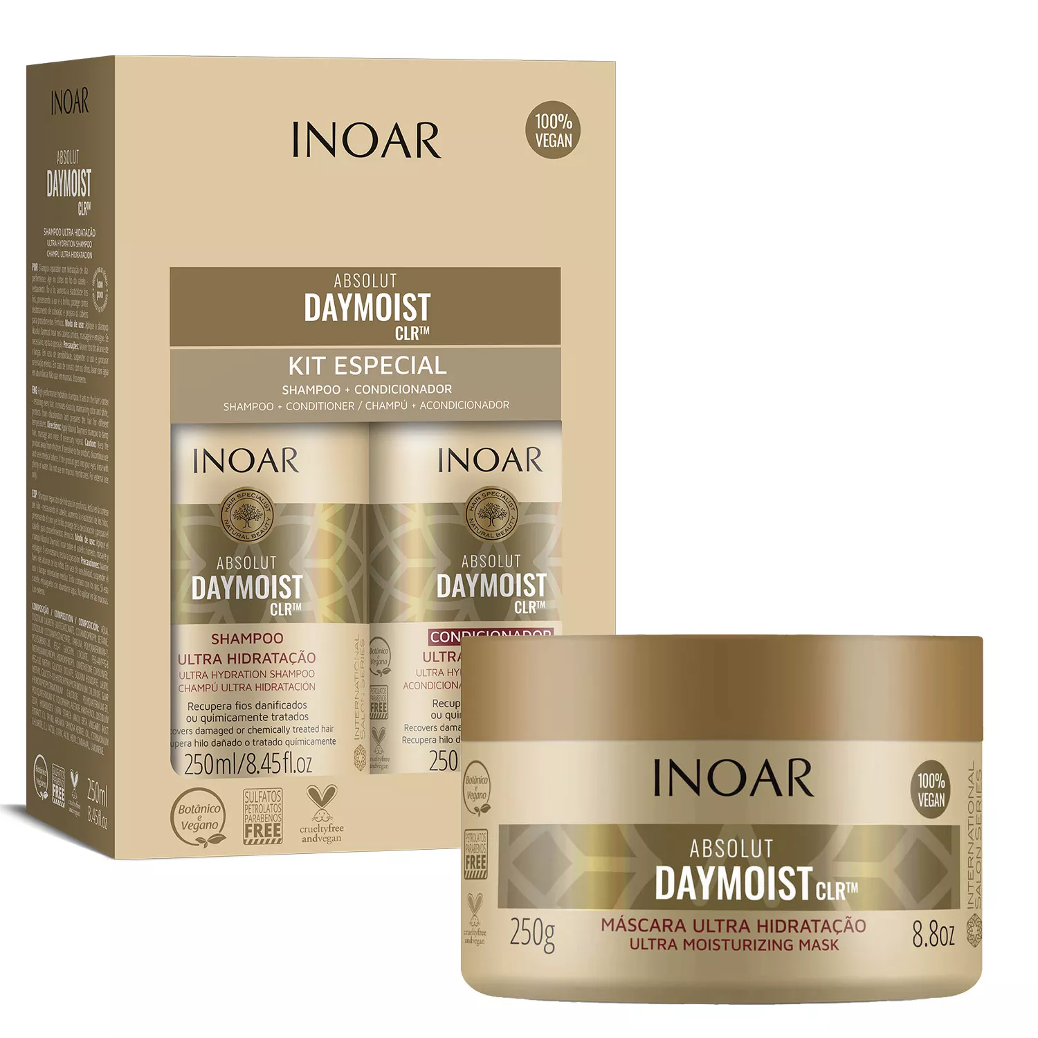 INOAR Daymoist CLR, wegański zestaw nawilżający: szampon + odżywka + maska, 3x250ml