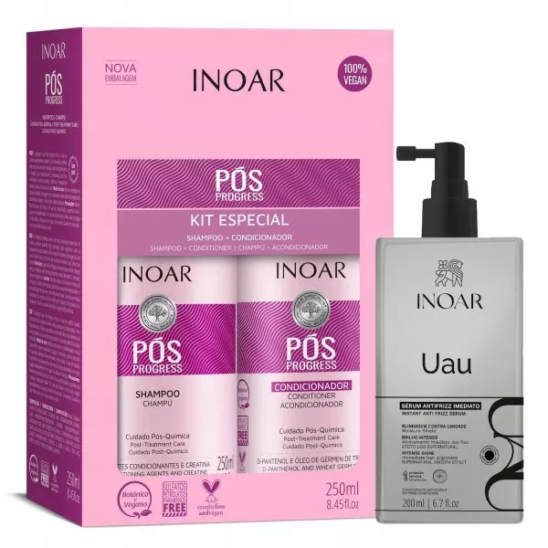 Zestaw INOAR POS Progress DUO PACK to kosmetyki dedykowane włosom po keratynowym prostowaniu. Uzupełniają one na bieżąco braki keratyny oraz przedłużają efekt wygładzenia. Ponadto w składzie znajduje się cenny D-Pantenol, który chroni włosy przed rozdwajaniem i zapewnia im miękkość oraz piękny wygląd. W składzie znajduje się także nanoserycyna, która odpowiedzialna jest za nano odbudowę struktury włosy. Kosmetyki przywracają odpowiednią masę cząsteczkową wlosom, wygładzają je i zapobiegają elektryzowaniu się. Działają też nablyszczająco, zmiękczają i poprawiają elastyczność. Szampon po kuracji keratynowej nadaje włosom blask i wygładzenie. Z kolei odżywka z keratyną, pantenolem oraz olejkiem z kiełków pszenicy zapobiega elektryzowaniu się włosów i podkreśla ich kształt.