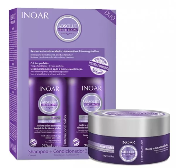 Zestaw INOAR Speed Blond przeznaczony jest do pielęgnacji włosów siwych i blond. Tonuje kolor oraz natychmiast poprawia koloryt, eliminując żółte refleksy. W składzie znajdziesz cenny olejek arganowy oraz aktywne antyoksydanty. Elementy te sprawiają. że włosy są elastyczne, nawilżone, lśniące i miękkie.