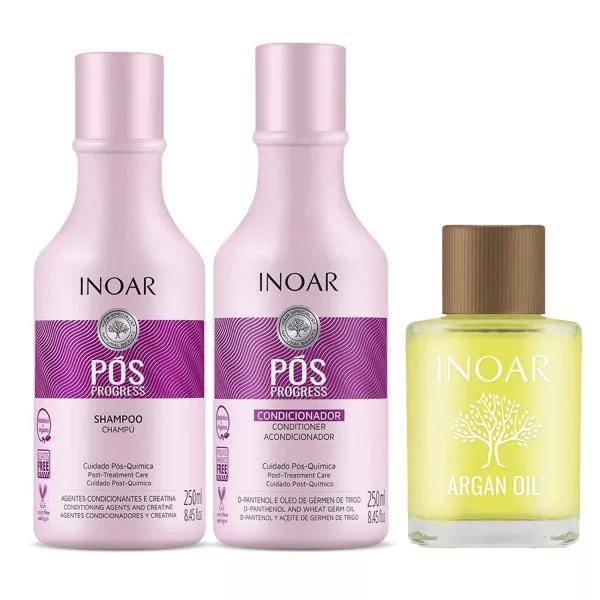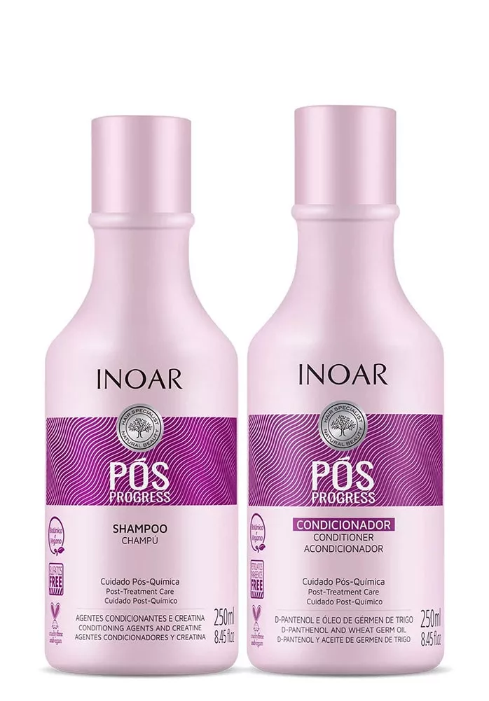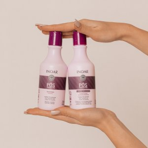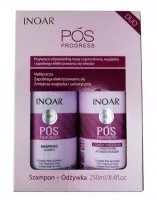 Zestaw INOAR POS Progress DUO PACK to kosmetyki dedykowane włosom po keratynowym prostowaniu. Uzupełniają one na bieżąco braki keratyny oraz przedłużają efekt wygładzenia. Ponadto w składzie znajduje się cenny D-Pantenol, który chroni włosy przed rozdwajaniem i zapewnia im miękkość oraz piękny wygląd. W składzie znajduje się także nanoserycyna, która odpowiedzialna jest za nano odbudowę struktury włosy. Kosmetyki przywracają odpowiednią masę cząsteczkową wlosom, wygładzają je i zapobiegają elektryzowaniu się. Działają też nablyszczająco, zmiękczają i poprawiają elastyczność. Szampon po kuracji keratynowej nadaje włosom blask i wygładzenie. Z kolei odżywka z keratyną, pantenolem oraz olejkiem z kiełków pszenicy zapobiega elektryzowaniu się włosów i podkreśla ich kształt.