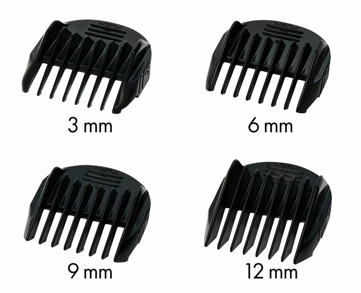 - 4 nasadki grzebieniowe w rozmiarach: 3, 6, 9, 12 mm, umożliwiające różnorodne długości cięcia.