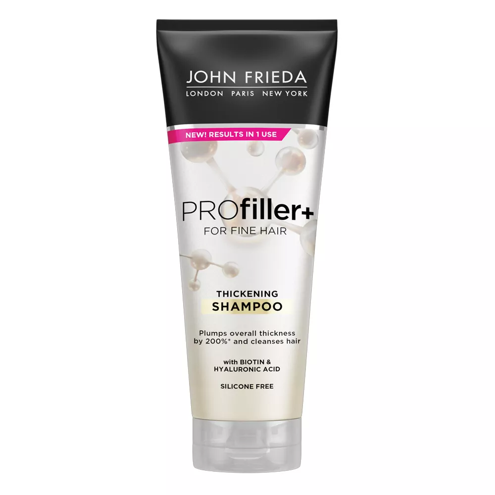 Szampon zagęszczający PROfiller+ zawiera biotynę, która słynna jest z właściwości wzmacniających włosy, oraz kwas hialuronowy, dbający o natychmiastowe nawilżenie.