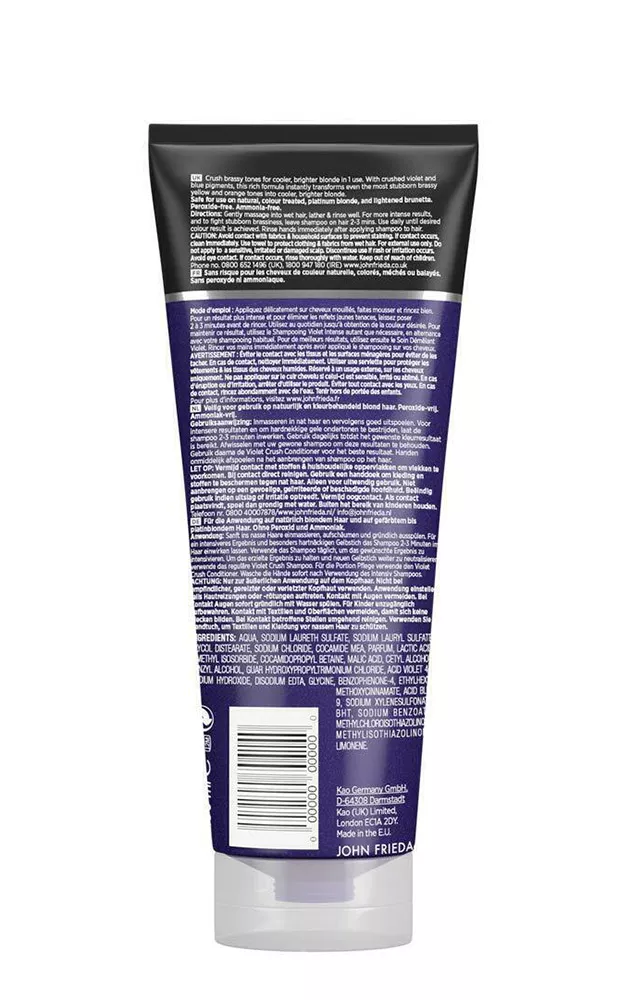 Fioletowy szampon do włosów blond John Frieda Violet Crush to idealne rozwiązanie dla osób pragnących szybko i skutecznie ochłodzić kolor swoich jasnych włosów oraz zniwelować żółte tony. Już po jednym użyciu zauważysz efekt chłodniejszego odcienia. Produkt jest odpowiedni dla każdego rodzaju blondu: naturalnego, farbowanego, rozjaśnianego oraz pasemek.