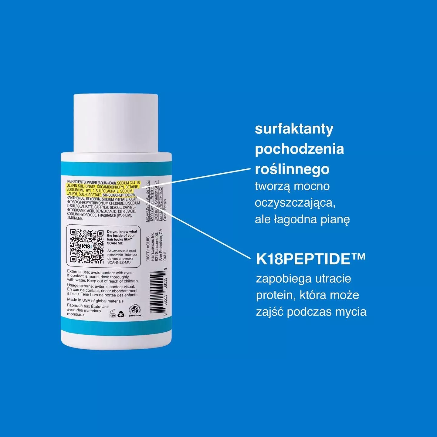 Szampon K18 Peptide Prep pH do częstego stosowania, bez naruszania optymalnego pH włosów i skóry głowy. Idealny do stosowania w ramach rutyny z molekularną maską K18. Jeśli szukasz łagodnego i częstego sposobu oczyszczenia, spróbuj szamponu utrzymującego pH, żeby zachować skórę głowy czystą i w optymalnej kondycji. Szampon zawiera peptyd K18PEPTIDE™, który odbudowuje włosy od wewnątrz.
