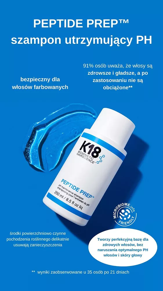 Szampon K18 Peptide Prep pH do częstego stosowania, bez naruszania optymalnego pH włosów i skóry głowy. Idealny do stosowania w ramach rutyny z molekularną maską K18. Jeśli szukasz łagodnego i częstego sposobu oczyszczenia, spróbuj szamponu utrzymującego pH, żeby zachować skórę głowy czystą i w optymalnej kondycji. Szampon zawiera peptyd K18PEPTIDE™, który odbudowuje włosy od wewnątrz.